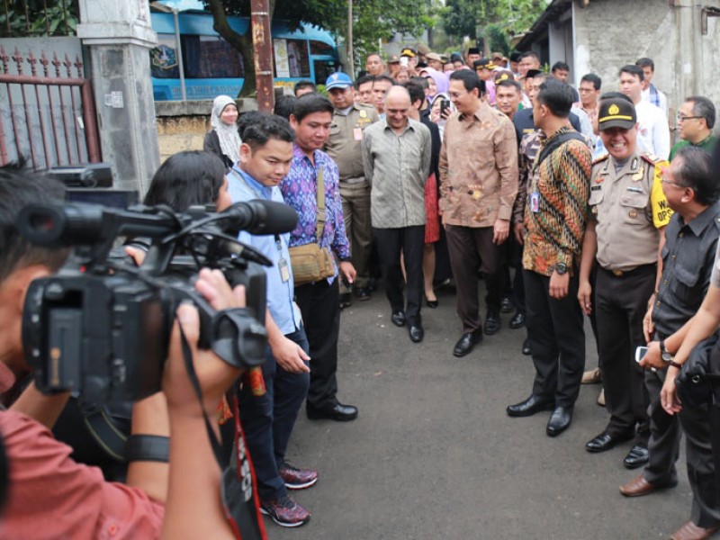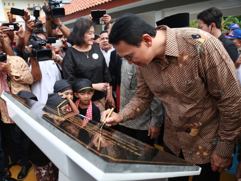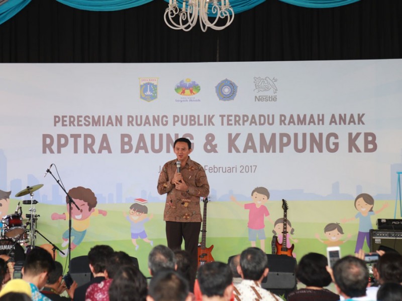Gubernur DKI Jakarta, Basuki Tjahaja Purnama meresmikan Ruang Publik Terpadu Ramah Anak (RPTRA) Baung di Jalan Baung, RT 04/02, Kelurahan Kebagusan, Kecamatan Pasar Minggu, Jakarta Selatan, Kamis (24/2). RPTRA Baung dilengkapi berbagai fasilitas seperti lapangan serbaguna, sarana bermain anak, tanaman hidroponik, tanaman obat keluarga, kolam ikan, PKK Mart dan lainnya . (Foto: Reza/beritajakarta.com)