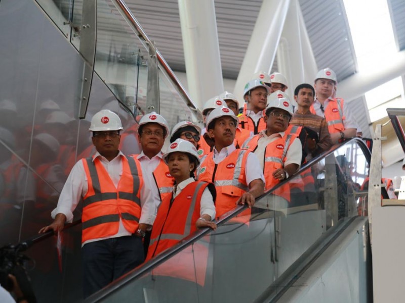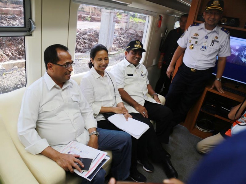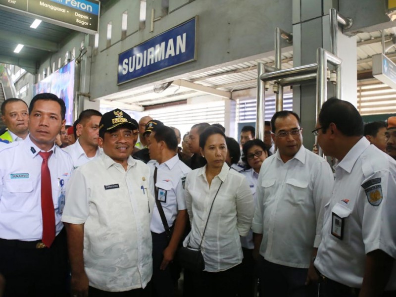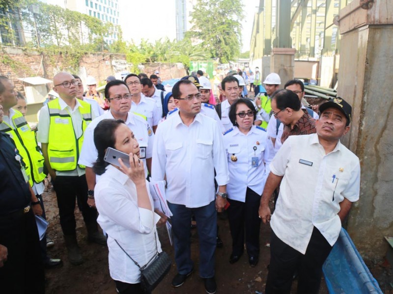 Pelaksana Tugas (Plt) Gubernur DKI Jakarta, Sumarsono, bersama dengan Menteri Perhubungan Budi Karya Sumadi dan Menteri BUMN Rini Soemarno meninjau proyek kereta Bandara Internasional Soekarno Hatta, Minggu (12/3). Peninjauan ini untuk melihat desain keterpaduan Mass Rapid Transit (MRT) di Stasiun Dukuh Atas, dan progres pembangunan stasiun-stasiun yang akan dilintasi kereta bandara yakni, Stasiun Sudirman Baru, Duri, Batu Ceper dan Stasiun Kereta Bandara Internasional Soekarno Hatta. (Foto: Reza/beritajakarta.com)