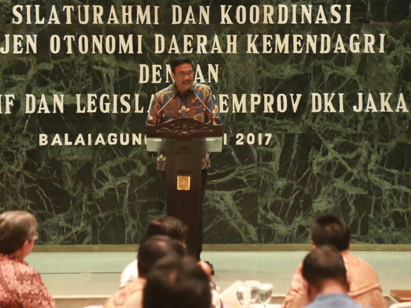 Dirjen Otonomi Daerah (Otda) Kementerian Dalam Negeri bersilaturahmi dan koordinasi dengan Eksekutif dan Legislatif Pemerintah Provinsi DKI Jakarta, di Balai Kota DKI Jakarta, Jumat (26/5). Acara ini dihadiri Dirjen Otda Kemendagri, Sumarsono, Plt Gubernur DKI Jakarta, Djarot Saiful Hidayat, Wakil Ketua DPRD DKI Jakarta, M Taufik, Wakil Ketua DPRD DKI Jakarta, Triwisaksana serta jajaran SKPD terkait. (Foto: R eza/beritajakarta.id)