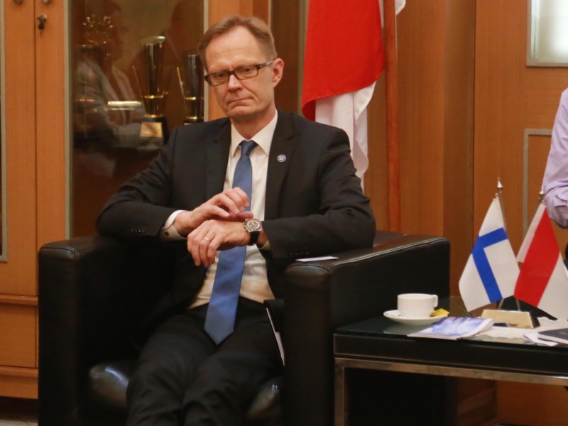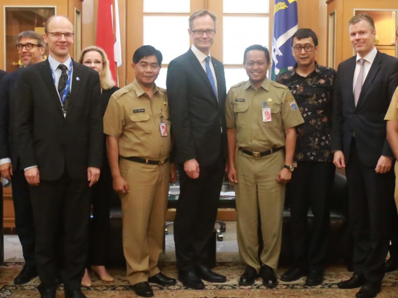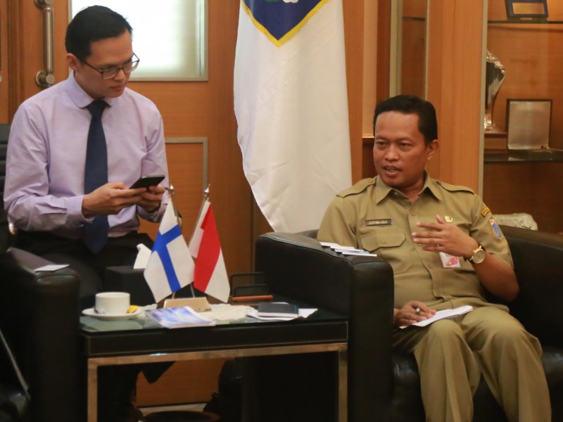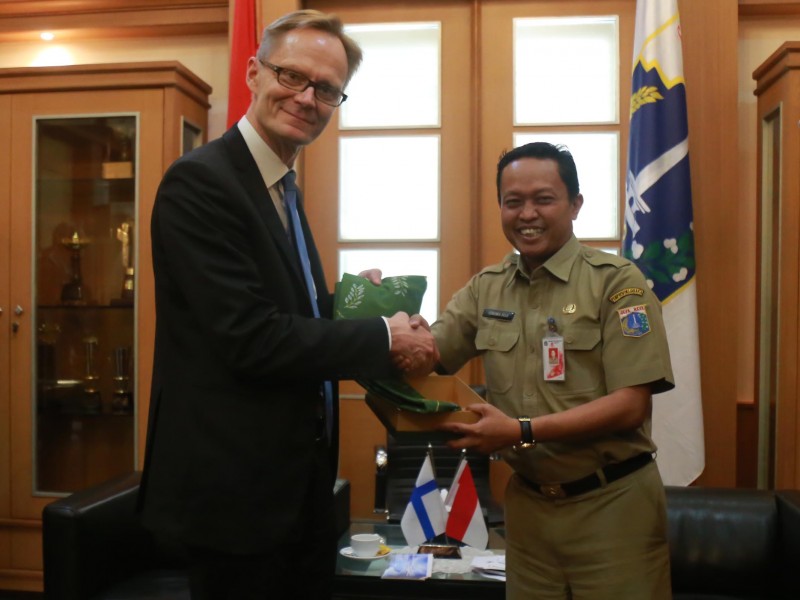 Wakil Menteri Perekonomian Finlandia, Petri Peltonen bersama dengan beberapa delegasi menyambangi Balai Kota DKI Jakarta, Selasa (6/6). Kehadiran para delegasi ini disambut oleh Kepala Dinas Lingkungan Hidup DKI Jakarta, Isnawa Adji serta jajaran SKPD terkait. (Foto: Reza/beritajakart a.id)