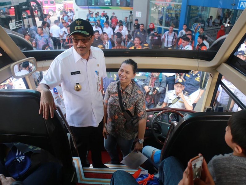 Pelaksana Tugas (Plt) Gubernur DKI Jakarta, Djarot Saiful Hidayat bertindak sebagai Inspektur Apel Kesiapan Arus Mudik dan Balik Angkutan Lebaran Hari Raya Idul Fitri 2017, di Terminal Terpadu Pulo Gebang, Cakung, Jakarta Timur, Rabu (14/6). Apel ini diikuti 500 petugas gabungan yang terdiri dari, SKPD, TNI, Polri, Orari, RAPI, anggota Pramuka, Jasa Marga dan Perusahaan Otobus (PO). (Foto: Reza/beritajakarta.id)