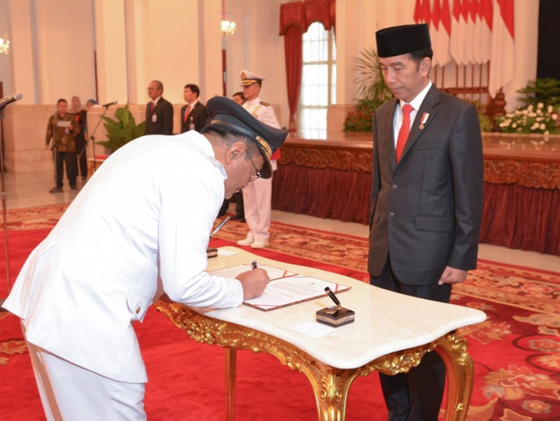 Presiden Republik Indonesia, Joko Widodo, resmi melantik Djarot Saiful Hidayat sebagai Gubernur DKI Jakarta sisa masa jabatan tahun 2012-2017. Prosesi pelantikan berlangsung di Istana Negara, Jl Medan Merdeka Utara, Gambir, Jakarta Pusat, Kamis (15/6). (Foto: Diskominfotik Prov DKI Jakarta)