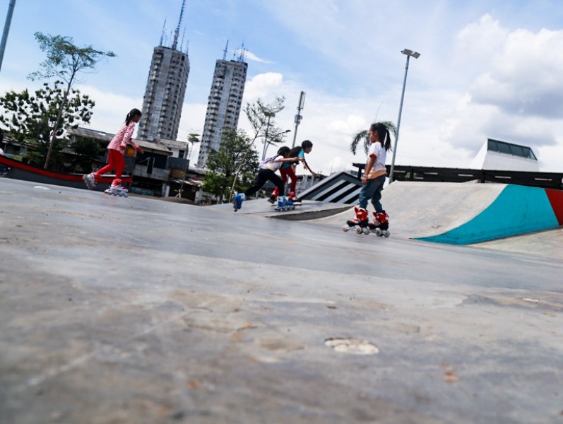 Ratusan warga menghabiskan waktu libur Lebaran di Ruang Terbuka Hijau (RTH) dan di Ruang Publik Terpadu Ramah Anak (RPTRA) Kalijodo, Jl. Kepanduan II, Tambora, Jakarta Barat, Selasa (27/6). Warga datang untuk berfoto, bermain (sepeda, sepatu roda) hingga sekadar bersantai bersama keluarga. (Foto: Reza/beritajakarta.id)
