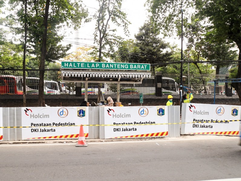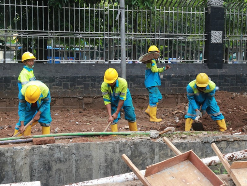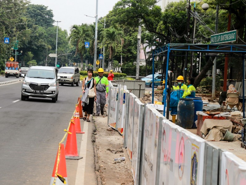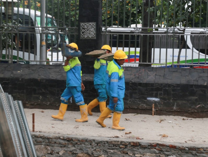 Pemerintah Provinsi DKI Jakarta melalui Dinas Bina Marga melakukan perbaikan jalur pedestrian atau trotoar di Jl Lapangan Banteng, Jakarta Pusat, Senin (17/7). Perbaikan dilakukan untuk memberikan kenyamanan bagi pejalan kaki. (Foto: Reza/beritajakarta.id)