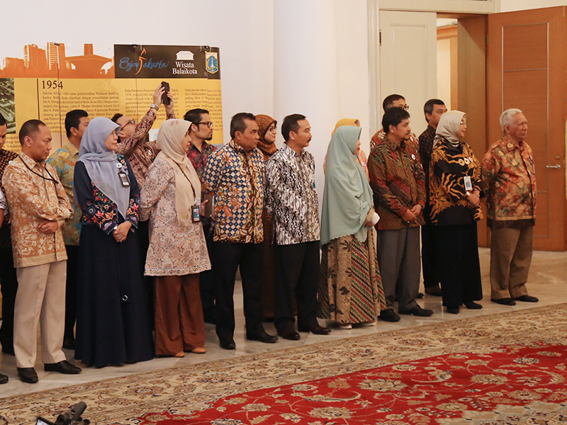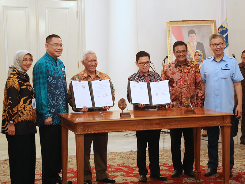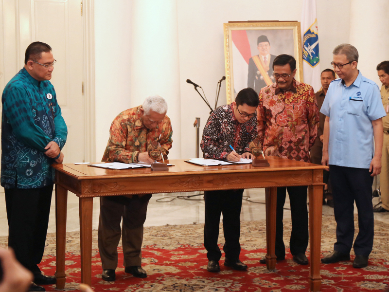 Gubernur DKI Jakarta, Djarot Saiful Hidayat menyaksikan penandatanganan kerja sama antara PT Transjakarta dengan Bank BNI Syariah di Balai Kota DKI Jakarta, Selasa (18/7). Kerja sama tersebut terkait pembelian unit bus sedang. (Foto: Punto/beritajakarta.id)