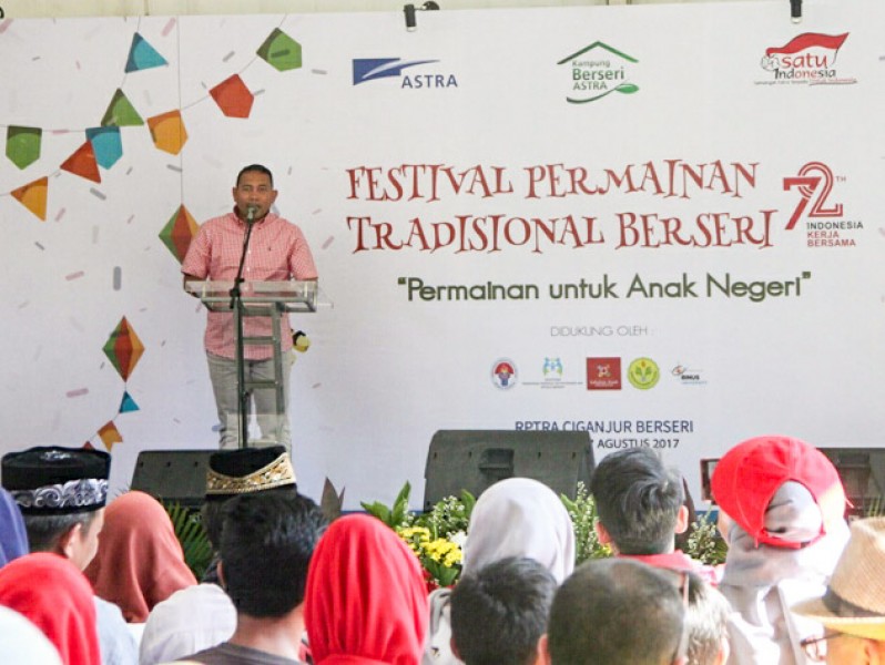 Wakil Wali Kota Jakarta Selatan, Arifin menghadiri acara Festival Permainan Tradisional Berseri di RPTRA Ciganjur Berseri, Jakarta Selatan, Minggu (27/8). Sebanyak 250 perwakilan anak RPTRA dari wilayah di DKI Jakarta ikut serta dalam permaianan yang dilombakan, diantaranya permainan Engrang, Dagongan dan Bakiak. (Foto: Reza/beritajakarta.id)