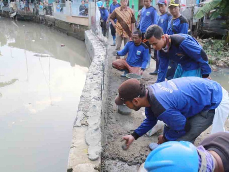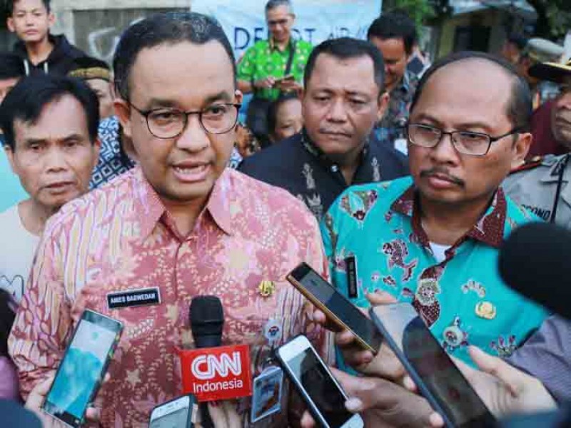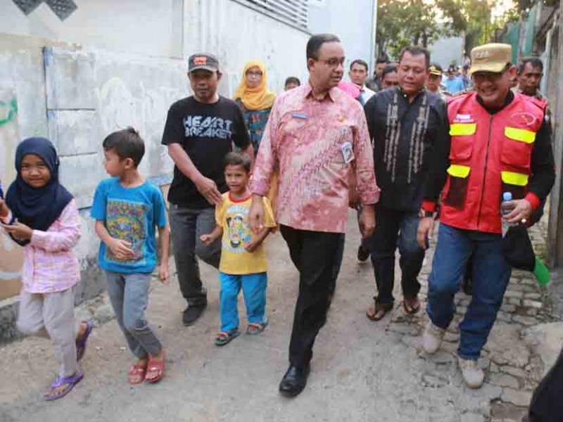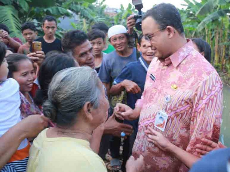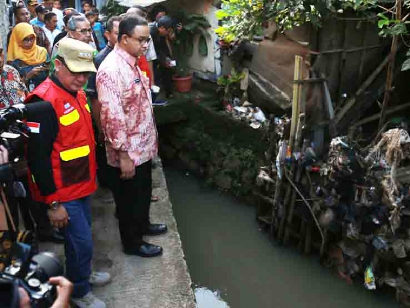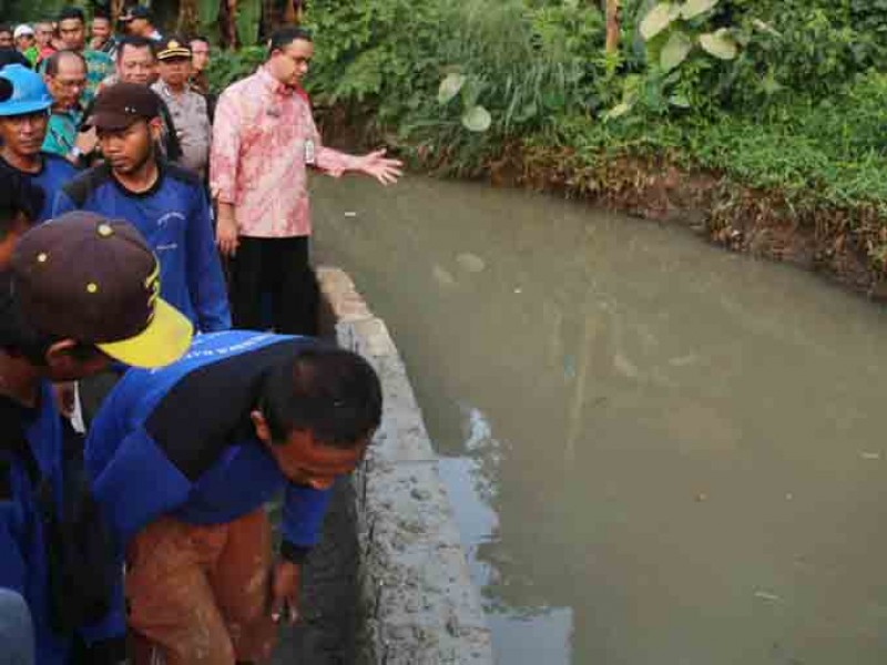 Gubernur DKI Jakarta, Anies Baswedan meninjau lokasi tanggul jebol di Gang Sabili, Jati Padang, Jakarta Selatan, Jumat (20/10). Dalam peninjauan, Anies menyaksikan perbaikan tanggul dan memastikan pengerukan pada kali akan dilakukan . (Foto: Reza/beritajakarta.id)