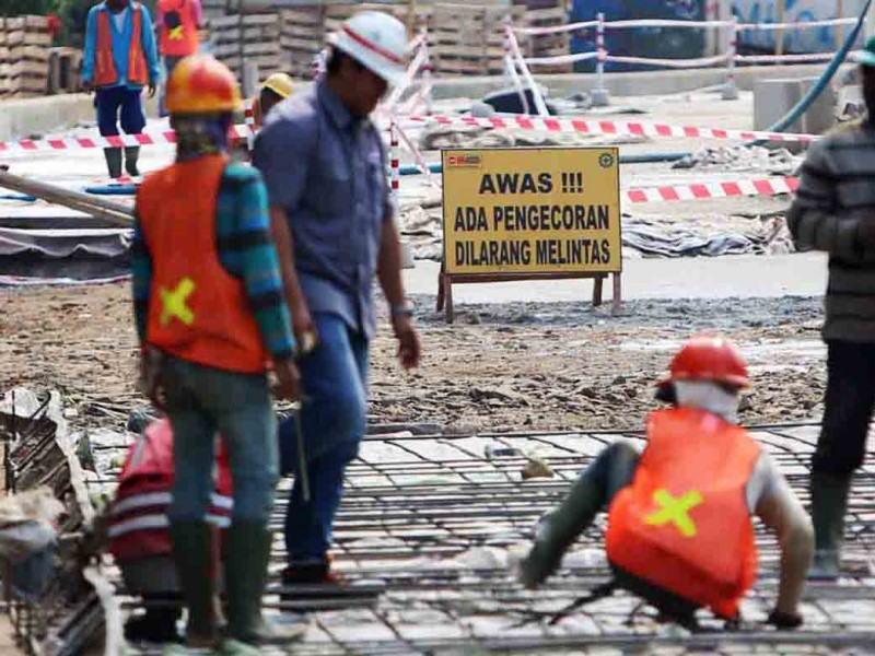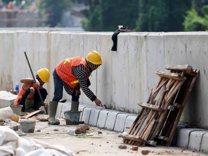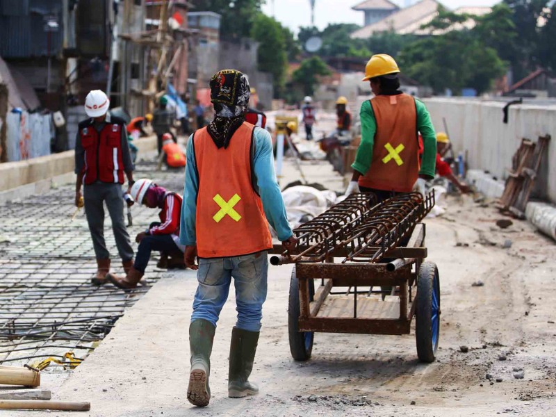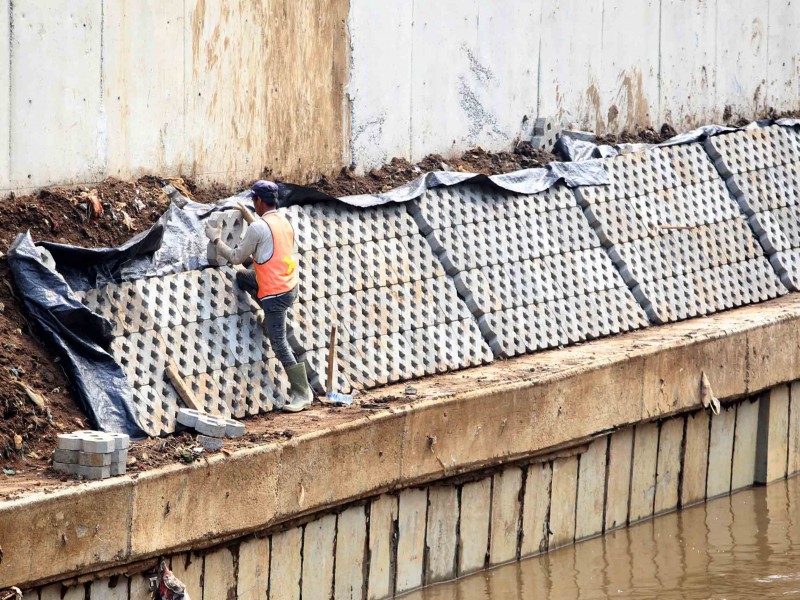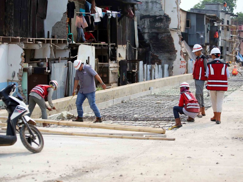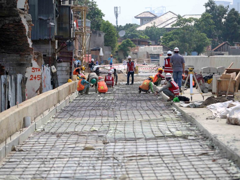 Pemerintah Provinsi (Pemprov) DKI Jakarta giatkan pengerjaan normalisasi Sungai Ciliwung, Bukit Duri, Jakarta Selatan, Jumat (20/10). Saat ini sedang berlangsung proses pengerjaan dinding turap dan pembetonan jalan inspeksi. Tujuannya untuk menguatkan bantaran sungai agar tidak longsor sekaligus antisipasi banjir. (Foto: Punto/beritajakarta.id)