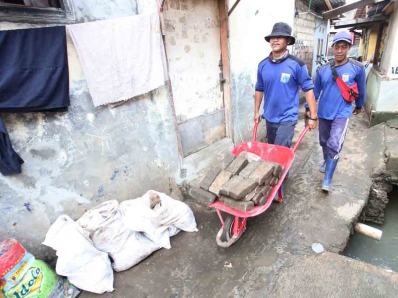 Sejumlah Petugas dari Dinas Tata Air Pemprov DKI Jakarta melakukan perbaikan tanggul jebol yang berada di RT 11 RW 06 Jati Padang, Jakarta Selatan, Jumat (20/10). (Foto: beritajakarta.id)