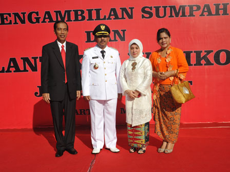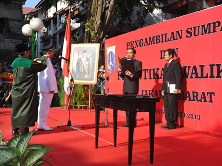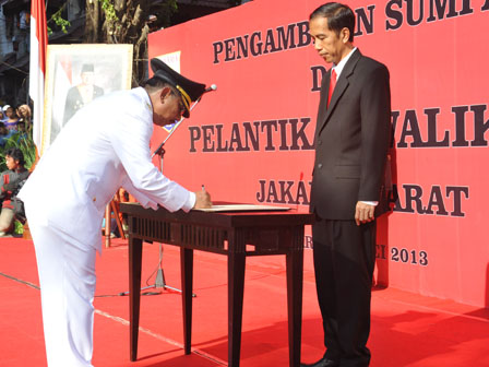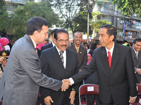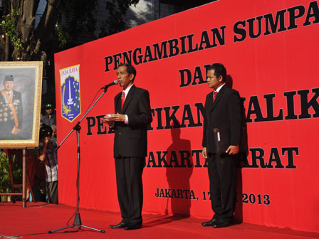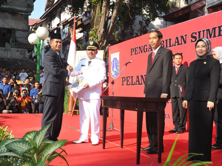 Gubernur DKI Jakarta Jokowi melantik Fatahillah yang sebelumnya menjabat sebagai Wakil Walikota Jakarta Pusat menjadi Walikota Jakarta Barat di Rusun Angke, Kelurahan Angke, Kecamatan Tambora, Jakarta Barat, Jumat (17/5). Jokowi juga berpesan agar Walikota Jakarta Barat yang baru saja dilantik menaruh atensi tinggi terhadap upaya revitalisasi Kota Tua, perbaikan jalan, serta kebersihan lingkungan utamanya saluran air. (Foto: Diskominfomas)