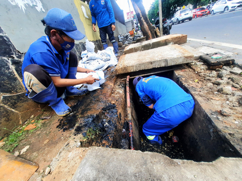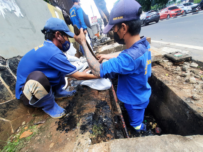 Satuan Tugas (Satgas) Sumber Daya Air Kecamatan Pancoran melakukan pengurasan saluran di Jalan Pasar Minggu Raya, Pancoran, Jakarta Selatan, Rabu (14/4). Pengurasan ini dilakukan untuk mengeruk sedimen lumpur yang berada di saluran air. (Foto: Reza Hapiz/beritajakarta.id)