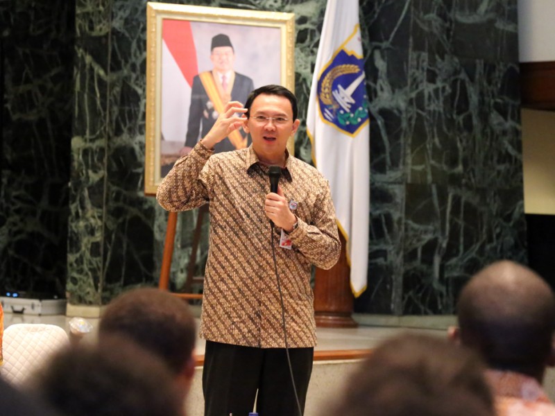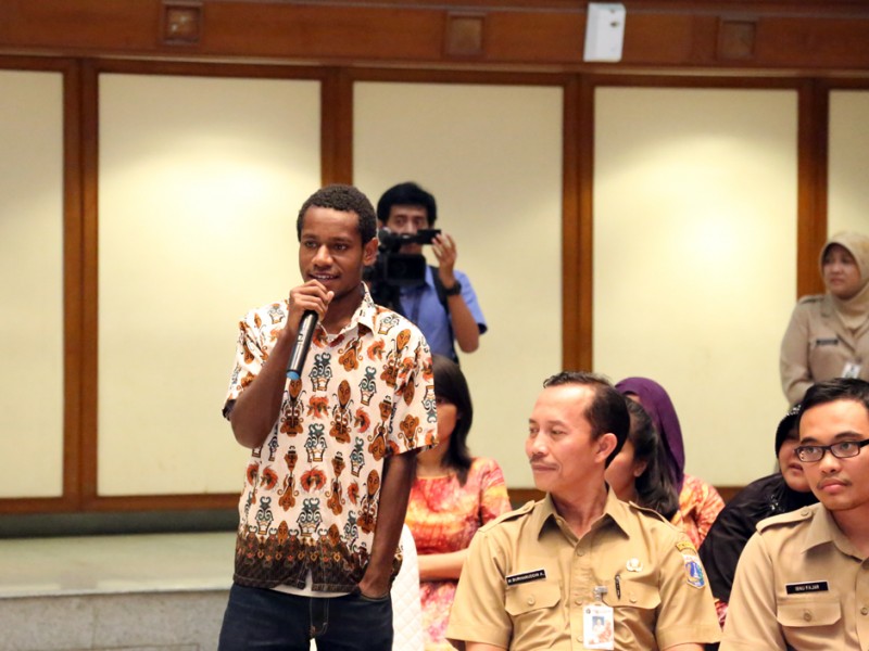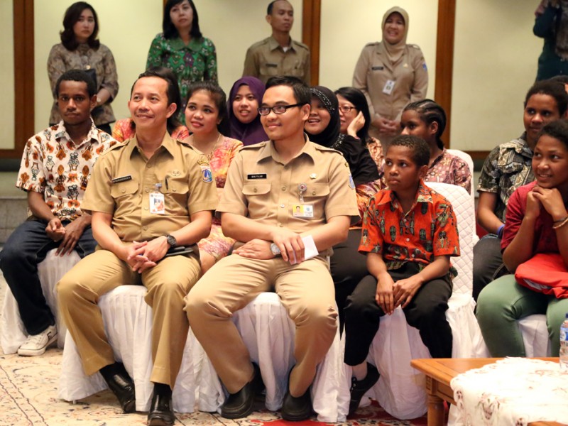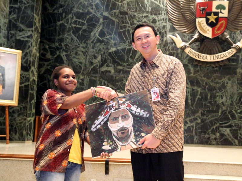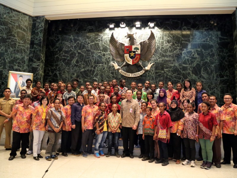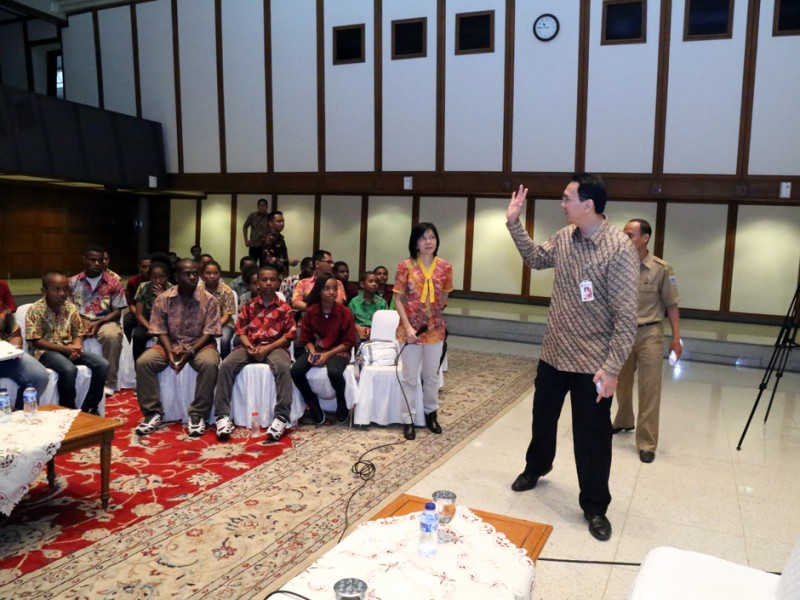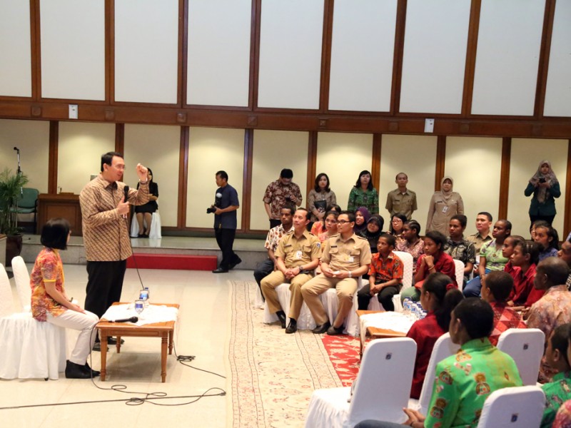 Gubernur DKI Jakarta, Basuki Tjahaja Purnama menerima kunjungan peserta didik Sekolah Anak Indonesia yang berasal dari Papua di Balaikota DKI Jakarta, Rabu (18/3/2015). Siswa dan siswi yang hadir ingin mengetahui lebih banyak terkait pemerintahan dan penataan kota Jakarta. (Foto : Yopie/Beritajakarta.com)