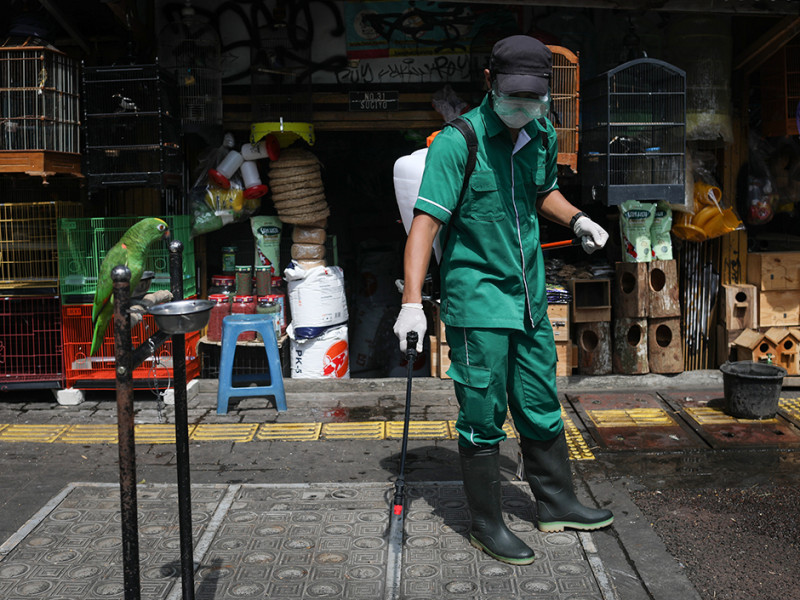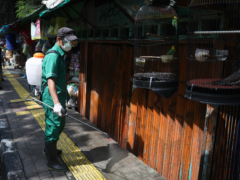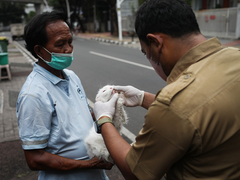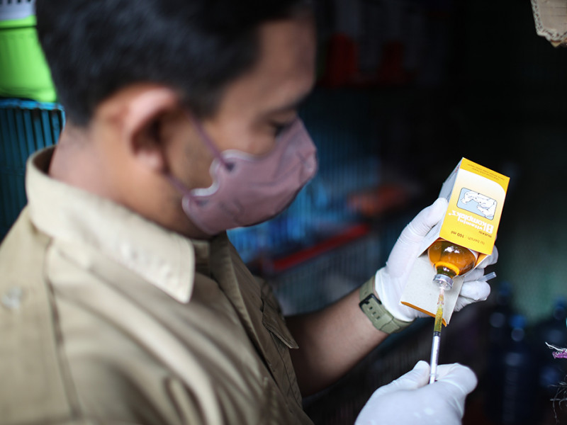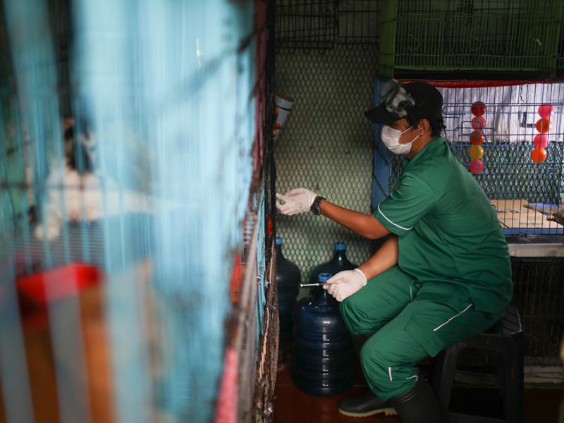 Suku Dinas Ketahanan Pangan, Kelautan, dan Pertanian (Sudin KPKP) Jakarta Selatan menggelar layanan vaksinasi untuk hewan penular rabies (HPR) di Pasar Barito, Kebayoran Baru, Jakarta Selatan, Senin (28/3). Selain vaksinasi, petugas juga memberikan vitamin serta melakukan disinfeksi guna mencegah penyebaran virus flu burung. (Foto: Nugroho Sejati/beritajakarta.id)
