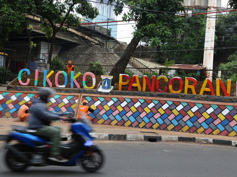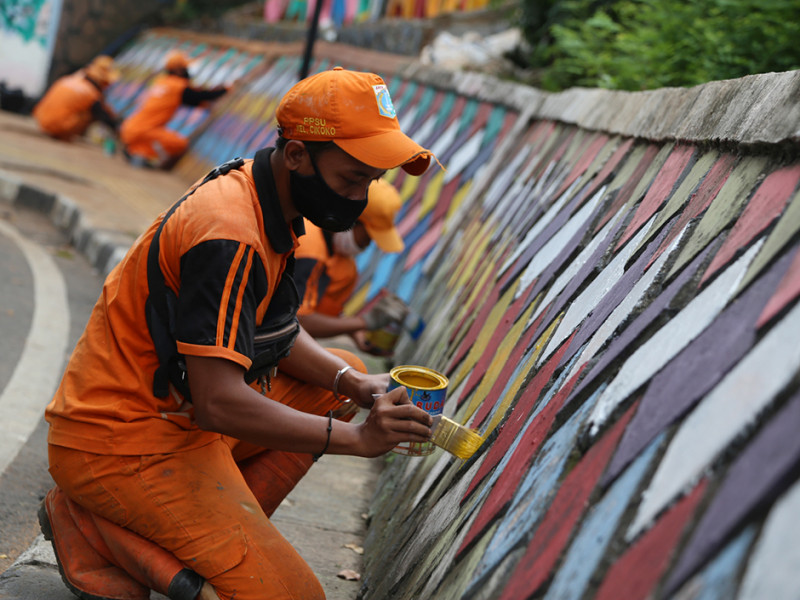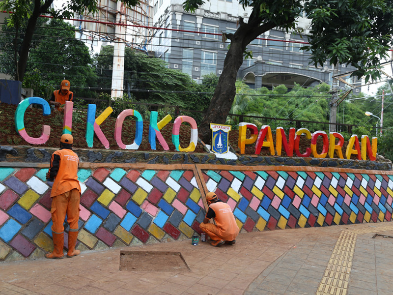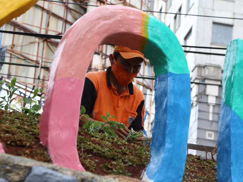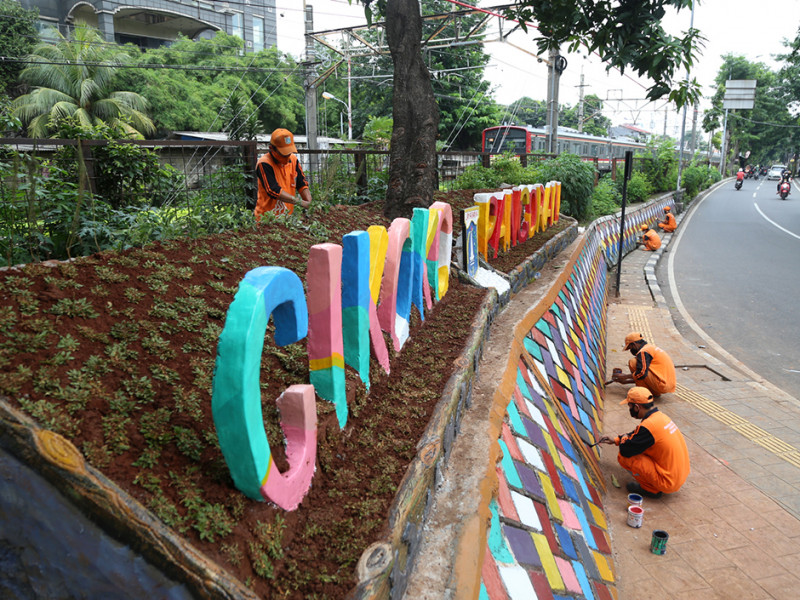 Pasukan oranye Kelurahan Cikoko, Kecamatan Pancoran, Jakarta Selatan melakukan pembuatan taman di Jalan Cikoko Timur Raya, RT 02/03, tepatnya samping terowongan Stasiun Cawang, Senin (28/3). Pembuatan taman ini dilakukan guna meningkatkan estetika sekaligus mempopulerkan nama Cikoko. (Foto: Reza Hapiz/beritajakarta.id)