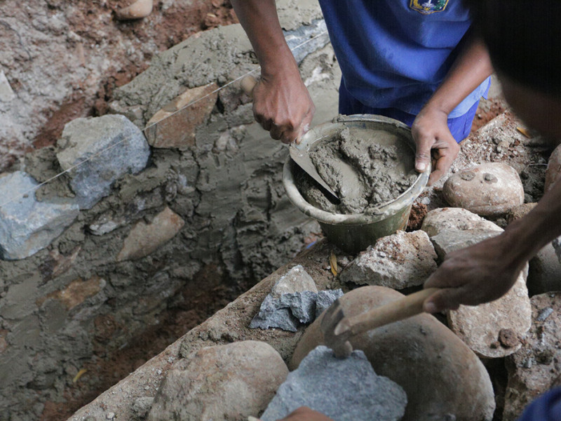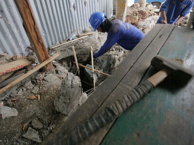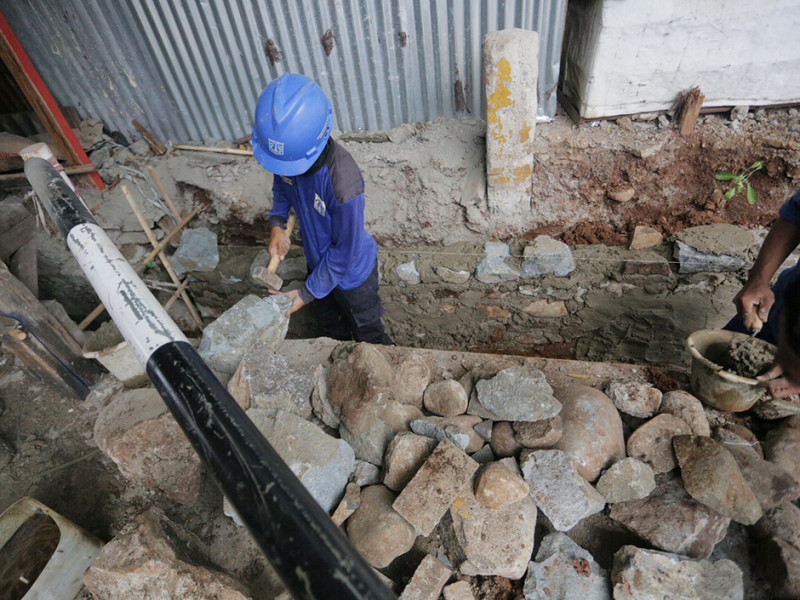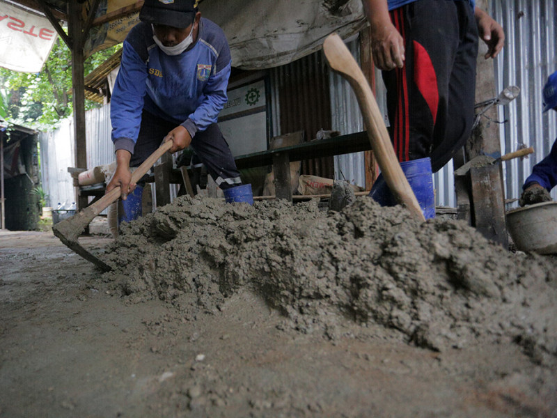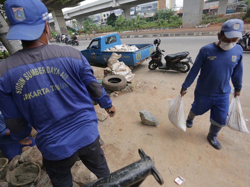 Satuan Pelaksana Sumber Daya Air (Satpel SDA) Kecamatan Makasar memperbaiki saluran air di Jalan Pangkalan Jati I, RT 01/13, Cipinang Melayu, Makasar, Jakarta Timur, Rabu (30/3). Perbaikan dilakukan lantaran kondisi turap saluran yang longsor. (Foto: Mochamad Tresna Suheryanto/beritajakarta.id)