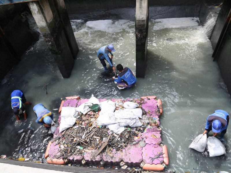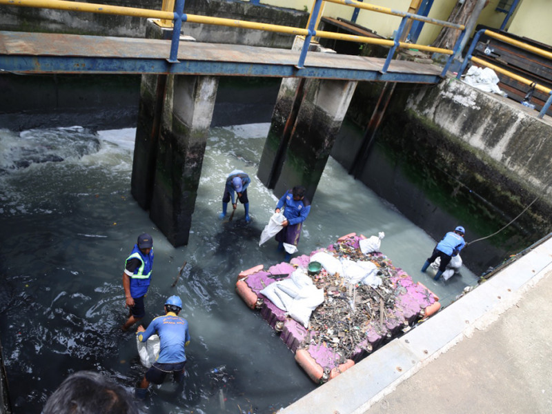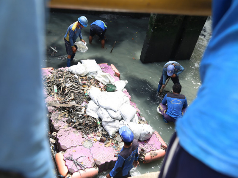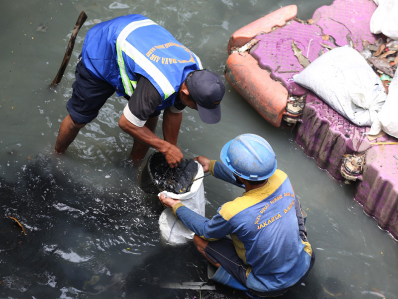 Suku Dinas Sumber Daya Air (Sudin SDA) Jakarta Barat menguras kolam olakan Rumah Pompa Jelambar, Jalan Jelambar Selatan II, Kelurahan Jelambar Baru, Grogol Petamburan, Jumat (01/4). Pengurasan kolam olakan seluas 32 meter persegi dan tinggi empat meter ini dilakukan dengan mengangkut sampah serta mengeruk lumpur sedalam 40 sentimeter. (Foto: Reza Hapiz/beritajakarta.id)
