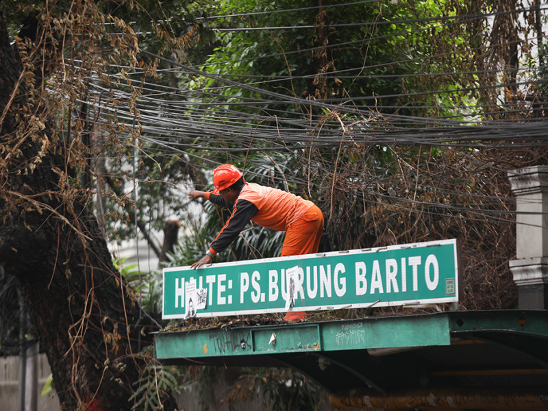 Petugas Penanganan Prasarana dan Sarana Umum (PPSU) Kelurahan Kramat Pela membersihkan tanaman mati di atas Halte Pasar Burung Barito, Kebayoran Baru, Jakarta Selatan, Jumat (1/4). Pembersihan dilakukan lantaran posisi cabang dan ranting pohon tersangkut di kabel sehingga dapat membahayakan warga khususnya pengguna halte. (Foto: Nugroho Sejati/beritajakarta.id)