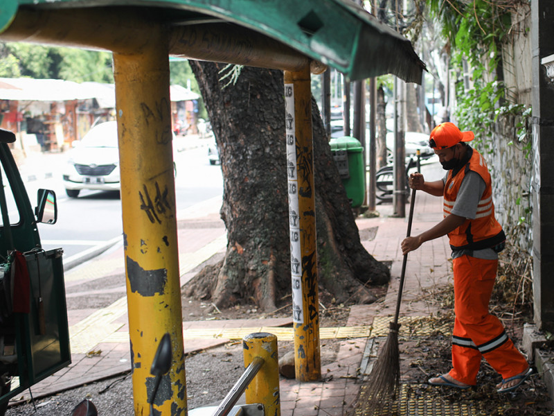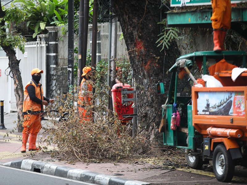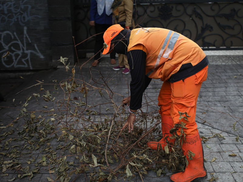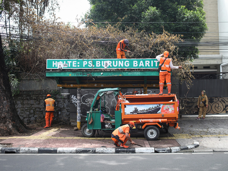 PPSU Kramat Pela Bersihkan Tanaman Mati di Halte Pasar Burung Barito