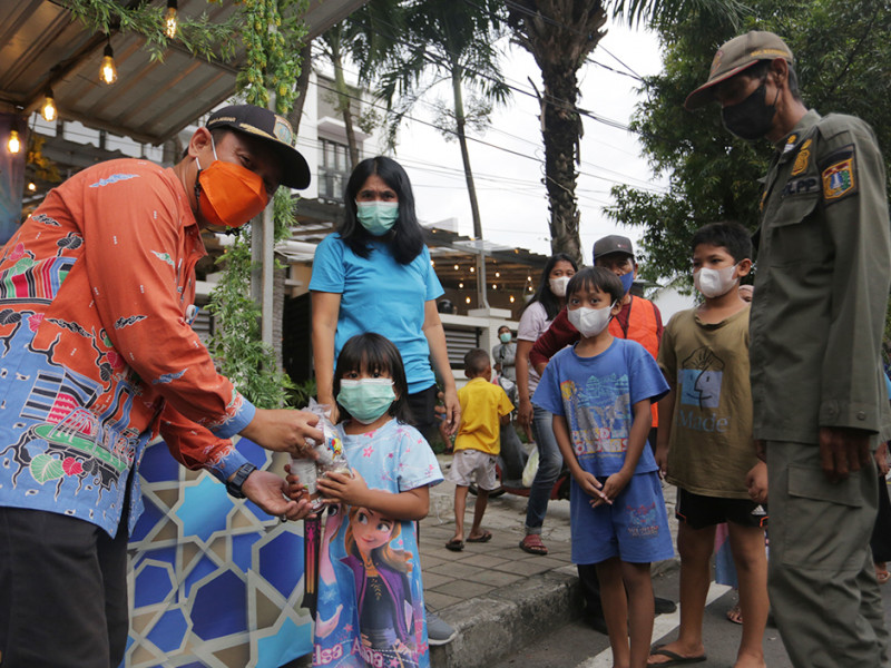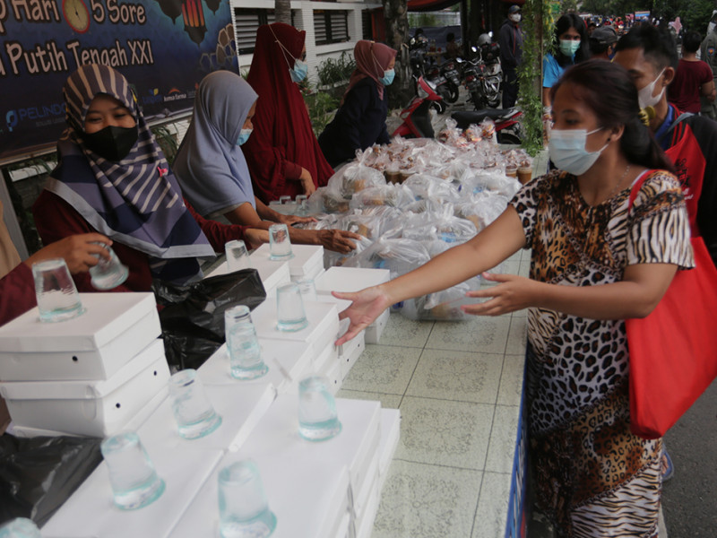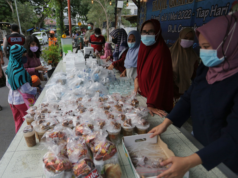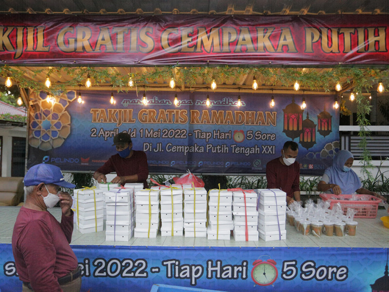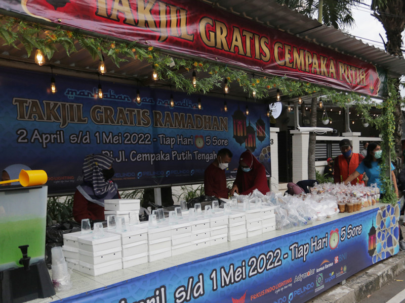 Warga RW 06 Kelurahan Cempaka Putih Timur, Jakarta Pusat bersama sejumlah donatur perorangan, perusahaan, dan BUMN membagikan ratusan takjil gratis di Jalan Cempaka Putih Tengah XXI, Kelurahan Cempaka Putih Timur, Kecamatan Cempaka Putih, Jakarta Pusat, Kamis (7/4). Pembagian takjil gratis di lokasi tersebut dilaksanakan setiap hari selama bulan Ramadan, yakni 2 April sampai 1 Mei 2022. (Foto: Mochamad Tresna Suheryanto/beritajakarta.id)