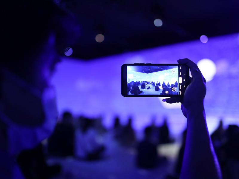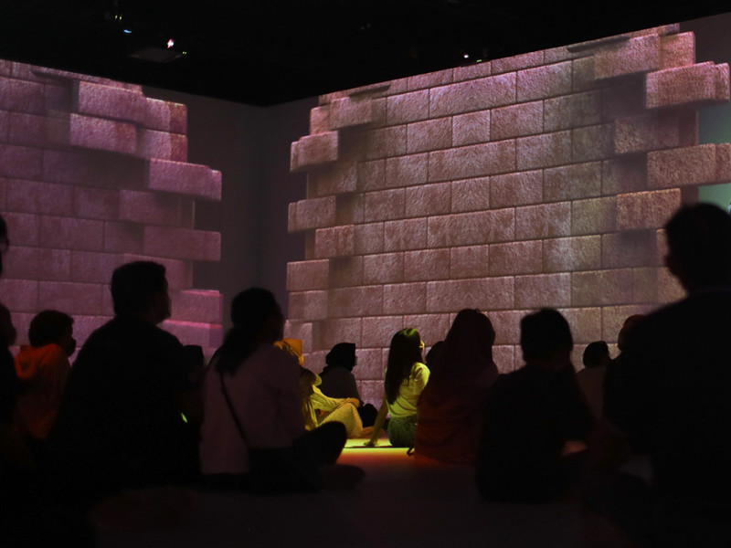 Pengunjung menyaksikan pertunjukan tiga dimensi dalam pameran Ruang ImersifA \"Ruang Baru Imajinasi\" di Museum Nasional, Gambir, Jakarta Pusat, Kamis (14/4). Fasilitas baru di Museum Nasional tersebut menyuguhkan lini masa dari zaman prasejarah Indonesia hingga masa kini. Pertunjukan yang berada di Gedung A itu berlangsung selama 30 menit yang diproyeksikan dengan sudut 360 derajat. (Foto: Nugroho Sejati/beritajakarta.id)
