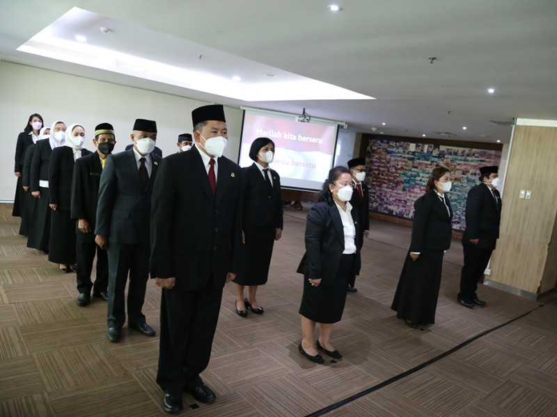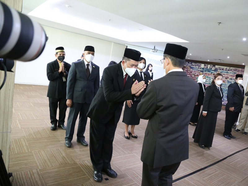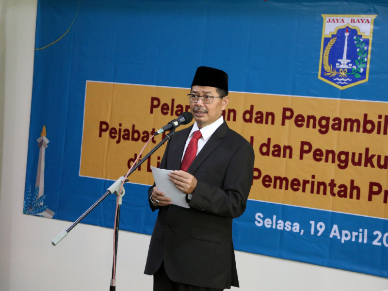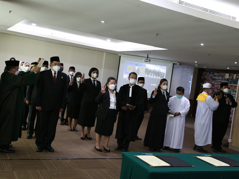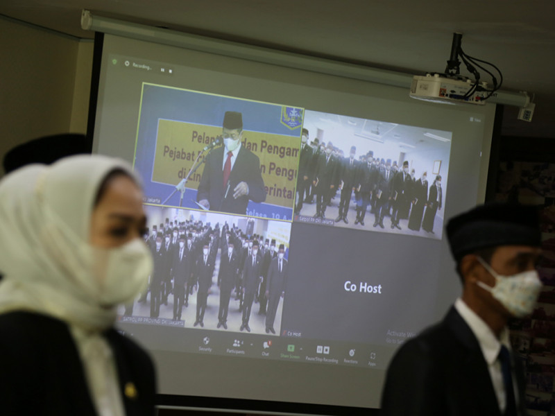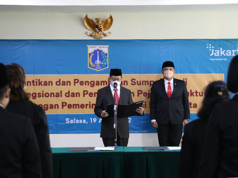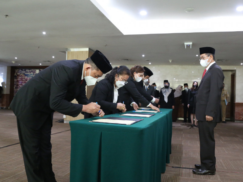 Sekretaris Daerah (Sekda) Provinsi DKI Jakarta, Marullah Matali melantik serta mengambil sumpah 180 pejabat fungsional dan struktural di lingkungan Pemerintah Provinsi DKI Jakarta, secara hybrid di Ruang Seribu Wajah, Blok G Balai Kota, Selasa (19/4). 180 ASN pejabat yang mengikuti sumpah jabatan terdiri dari 174 pejabat fungsional dan enam pejabat struktural. Semuanya berasal dari tujuh organisasi perangkat daerah (OPD) yakni, Dinas Perhubungan; Dinas Perindustrian, Perdagangan, Koperasi, Usaha Kecil dan Menengah (PPKUKM); Dinas Lingkungan Hidup (LH); Dinas Pendidikan; Dinas Kesehatan; Satpol PP; dan Biro Hukum. (Foto: Reza Hapiz/beritajakarta.id)