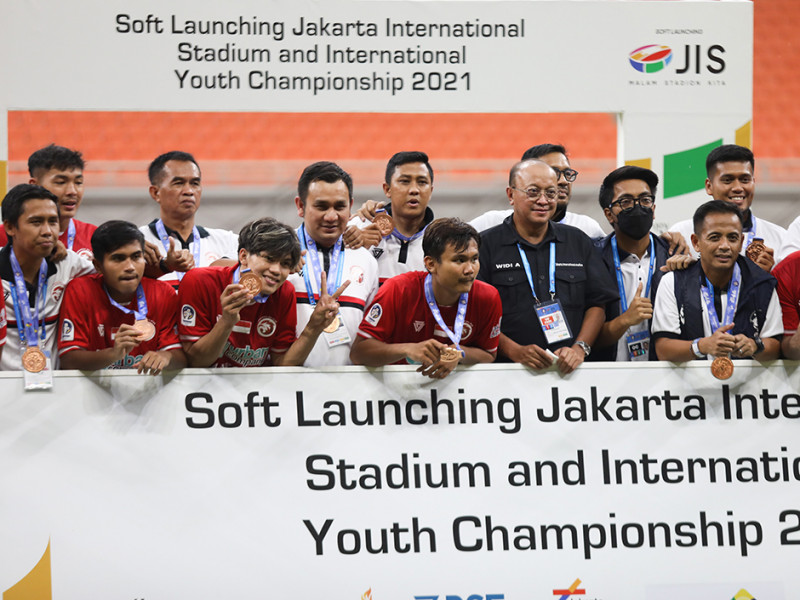 Indonesia All Star U-20 meraih peringkat ketiga usai mengalahkan Bali United U-18 pada turnamen International Youth Cup (IYC) 2021 di Jakarta International Stadium (JIS), Tanjung Priok, Jakarta Utara, Selasa (19/4). Indonesia All Star U-20 berhasil menang 2-1 atas Bali United U-18 lewat pertandingan yang ketat. Brylian Aldama mencetak gol kemenangan Indonesia All Star U-20 melalui titik putih di menit-menit akhir laga. (Foto: Nugroho Sejati/beritajakarta.id)