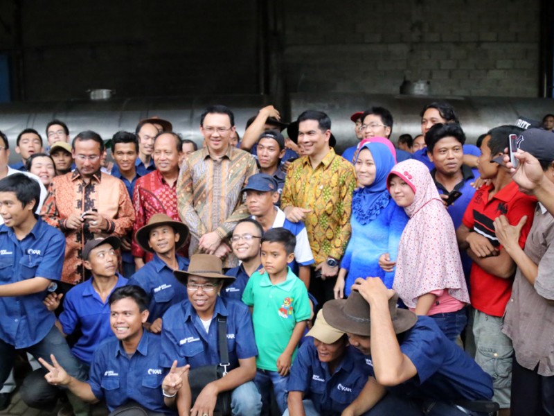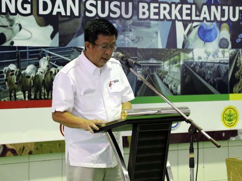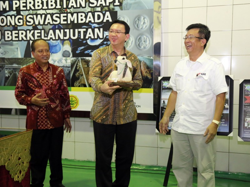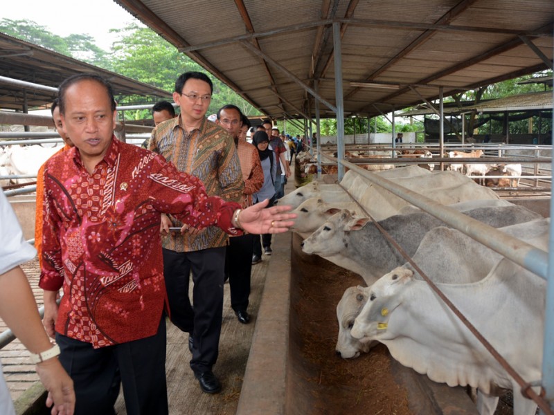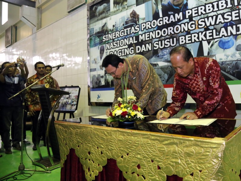 Gubernur DKI Jakarta, Basuki Tjahaja Purnama dan Menteri Riset Teknologi dan Pendidikan Tinggi (Menristek Dikti), Muhammad Nasir melakukan penandatanganan Memorandum of Understanding (MoU) terkait Penerapan dan Pengembangan Agribisnis Peternakan Sapi Terpadu. Prosesi penandatanganan MoU dilakukan di kantor PT Karya Anugerah Rumpin (KAR), Jalan Raya Cibodas, Rumpin, Bogor, Jawa Barat, Jumat (27/3/2015). Usai penandatanganan MoU ini diharapakan swasembada sapi segera terwujud. (Foto : Yopie/Beritajakarta.com)