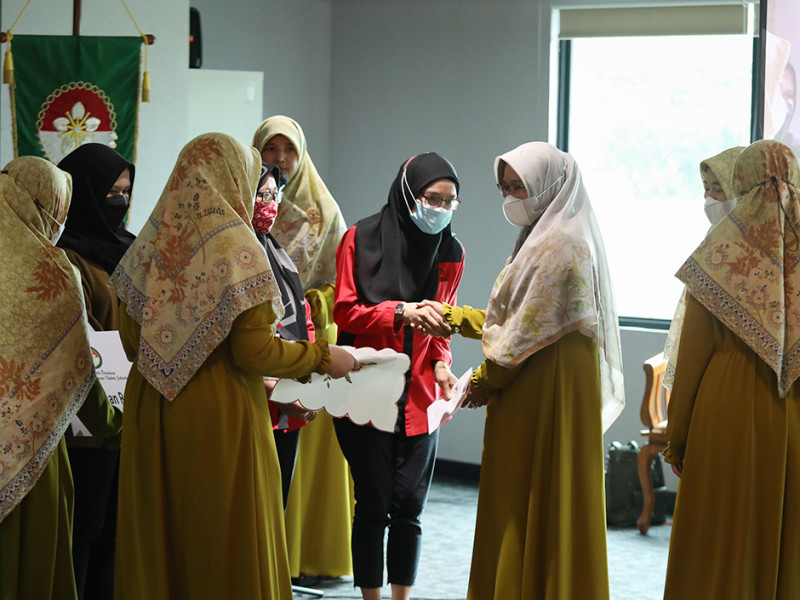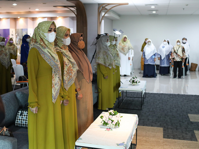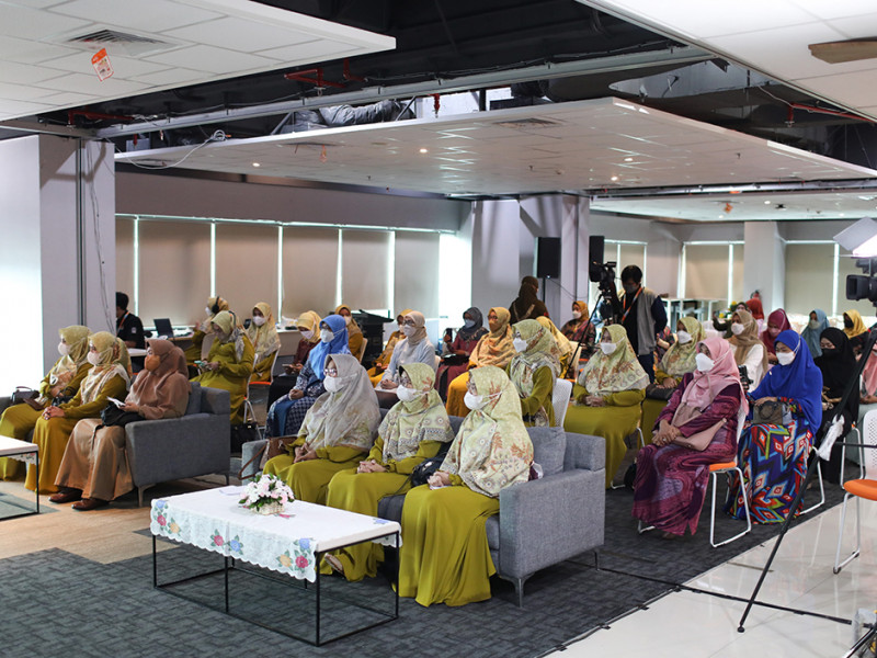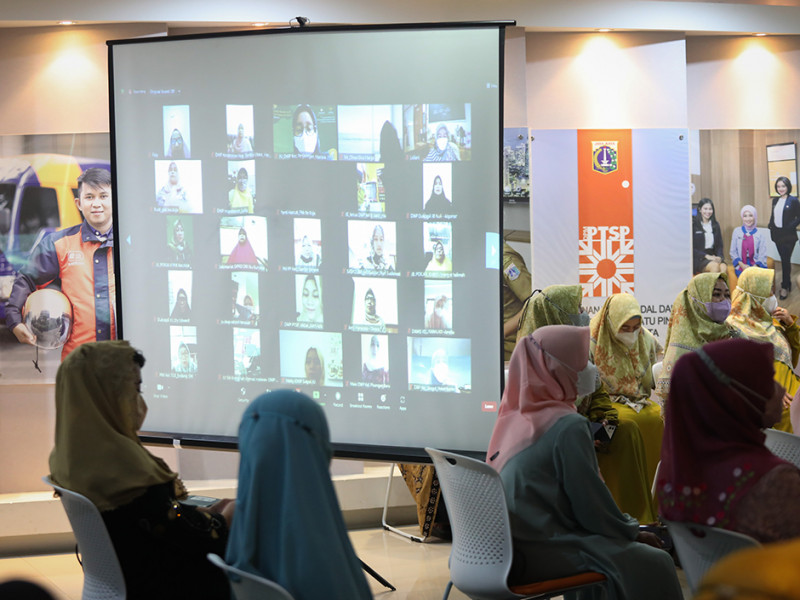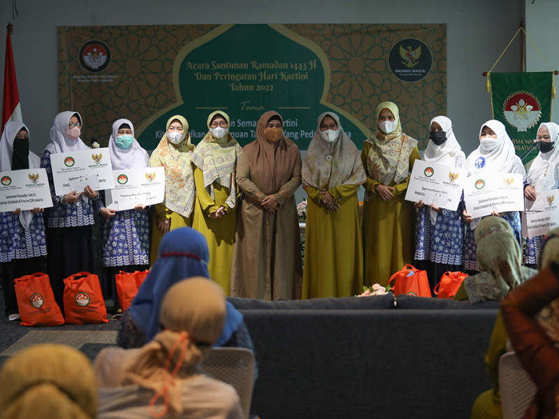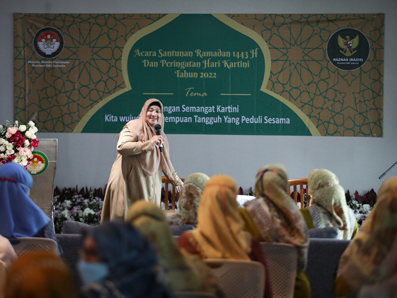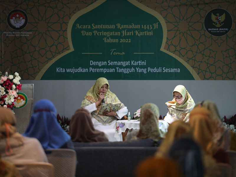 Dharma Wanita Persatuan (DWP) DKI Jakarta memperingati Hari Kartini dengan memberikan santunan Ramadan kepada anak yatim dan ustazah di Aula DMPTSP, Setiabudi, Jakarta Selatan, Kamis (21/4). Acara digelar secara hybrid, yakni secara langsung dan virtual. Santunan secara simbolis diberikan kepada perwakilan ustazah dan anak yatim dari setiap wilayah di DKI Jakarta. (Foto: Nugroho Sejati/beritajakarta.id)