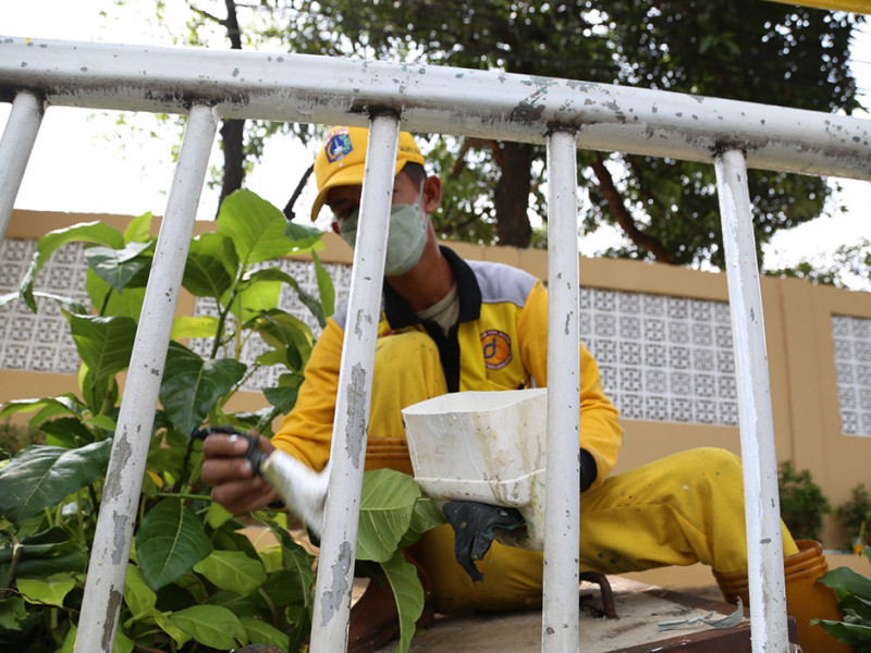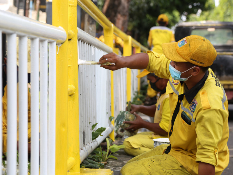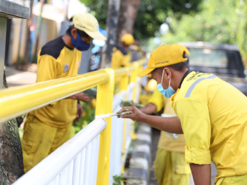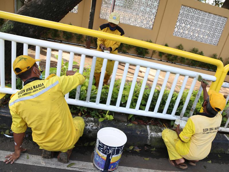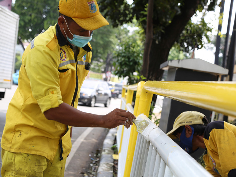 Petugas Suku Dinas (Sudin) Bina Marga Jakarta Selatan melakukan pengecatan ulang pagar pembatas trotoar di Jalan Raya Kalibata, Pancoran, Jakarta Selatan, Kamis (21/4). Pengecatan dilakukan untuk meningkatkan kenyamanan dan estetika di kawasan tersebut. (Foto: Reza Hapiz/beritajakarta.id)
