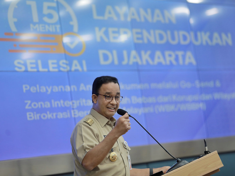 Gubernur DKI Jakarta, Anies Baswedan menghadiri peluncuran Layanan Kependudukan di Jakarta 15 Menit Selesai di Ruang Pola, Balai Kota, Jakarta Pusat, Selasa (19/4). Sebanyak 12 layanan kependudukan dapat diselesaikan dalam waktu 15 Menit menit oleh Dinas Kependudukan dan Pencatatan Sipil (Dukcapil) DKI Jakarta. (Foto: Dadang Kusuma Wira Putra/beritajakarta.id)