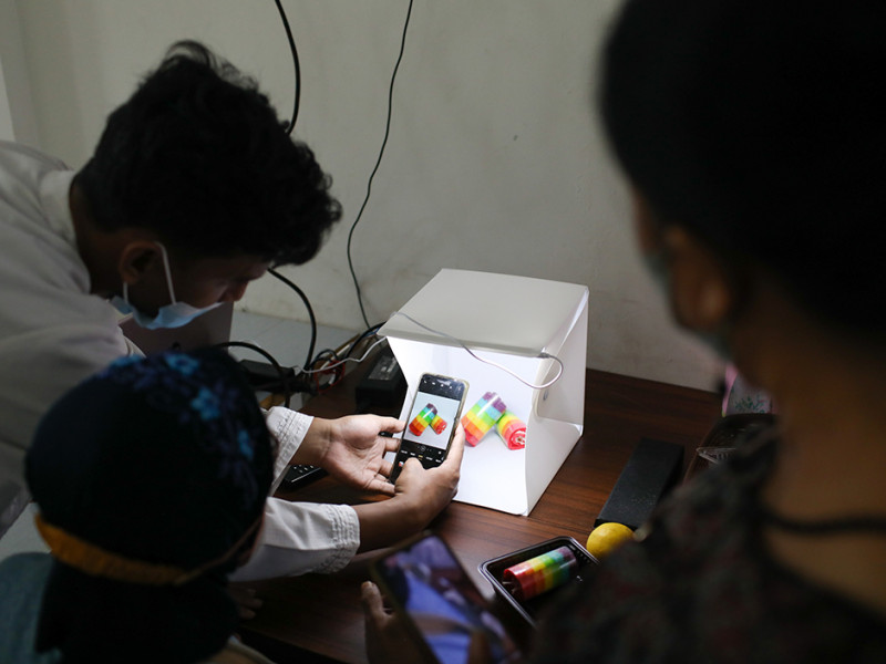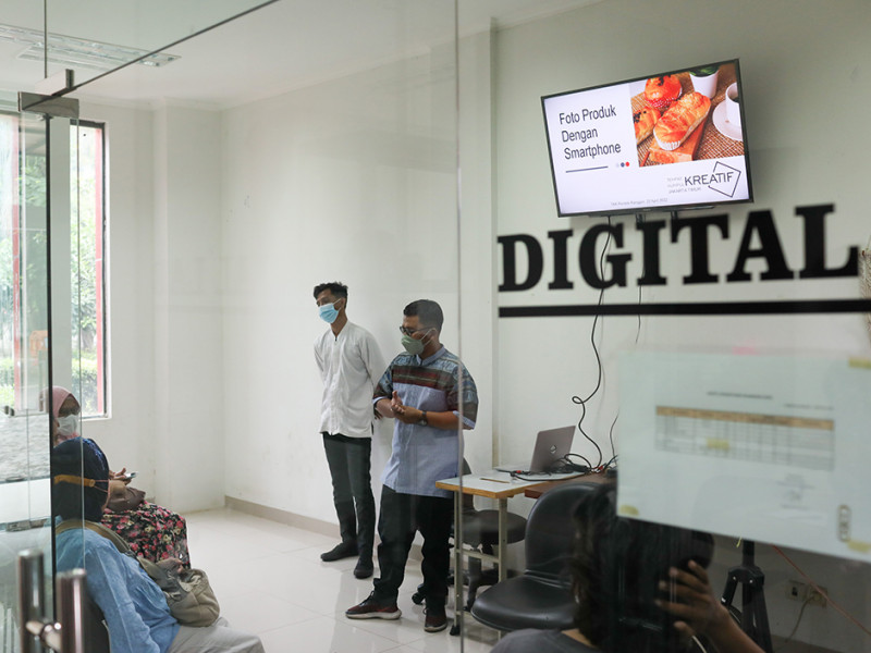 Delapan pelaku usaha mikro, kecil, dan menengah (UMKM) menjalani pelatihan fotografi menggunakan kamera smartphone di Tempat Kumpul Kreatif (TKK) Pondok Ranggon, Cipayung, Jakarta Timur, Jumat (22/4). Peserta pelatihan diberikan teori dasar terlebih dulu sebelum melakukan praktik memotret dengan objek foto produk mereka masing-masing. Pelatihan dari Suku Dinas PPKUKM Jakarta Timur tersebut diberikan secara gratis untuk meningkatkan daya saing para pelaku UMKM dalam memasarkan produk unggulannya. (Foto: Nugroho Sejati/beritajakarta.id)