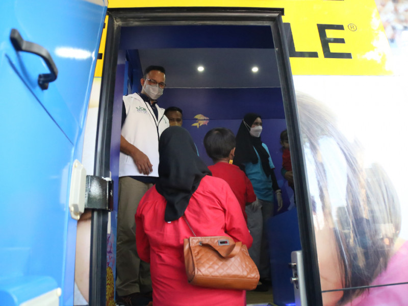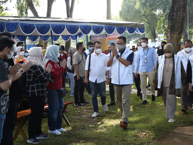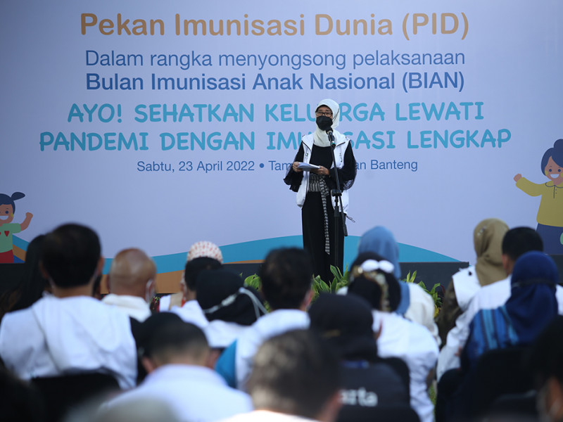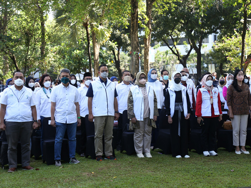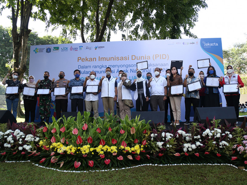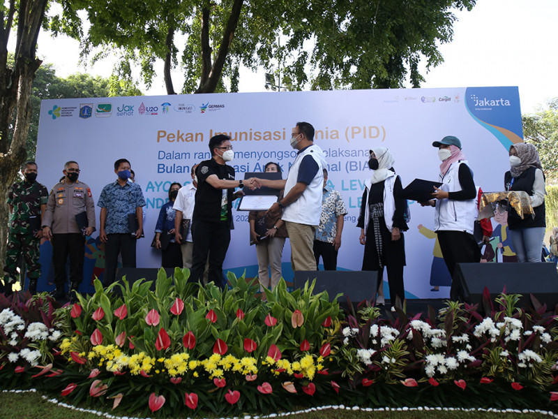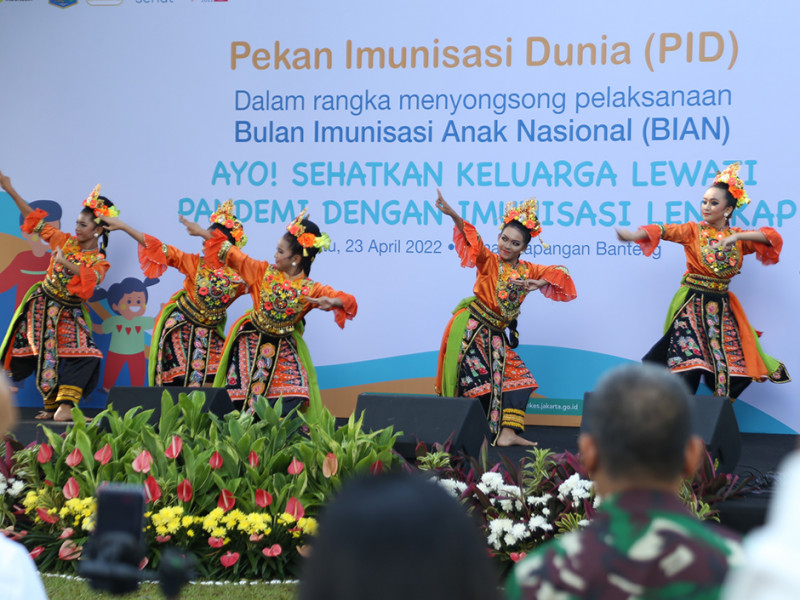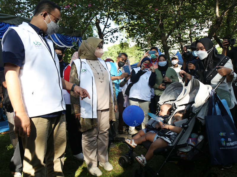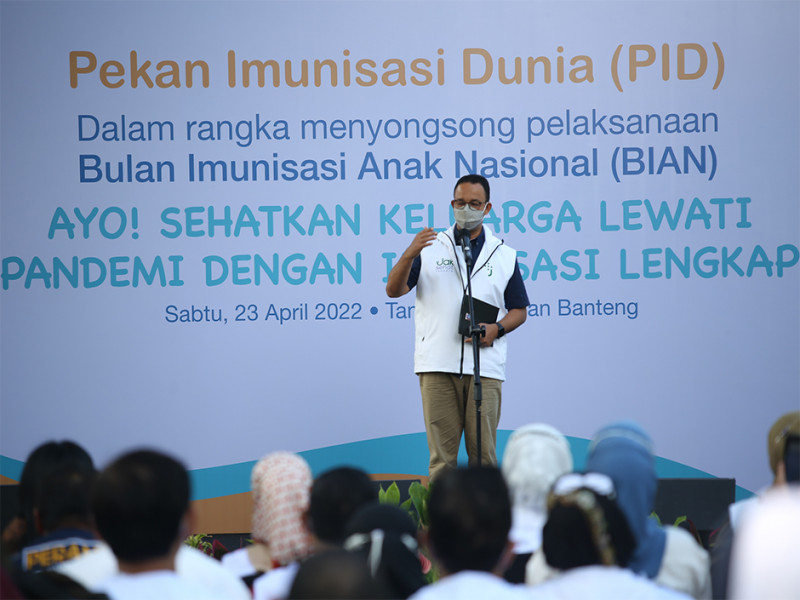 Gubernur DKI Jakarta, Anies Baswedan menghadiri puncak acara Pekan Imunisasi Dunia (PID) tahun 2022 di Lapangan Banteng, Jakarta Pusat pada Sabtu (23/4). Acara yang diadakan Dinas Kesehatan (Dinkes) DKI Jakarta ini mengusung tema ‘Sehatkan Keluarga Lewati Pandemi dengan Imunisasi Lengkap’ diadaptasi dari tema global yakni ‘Long Life for All Pursuit of A Long Life Well Lived’. (Foto: Mochamad Tresna Suheryanto/beritajakarta.id)