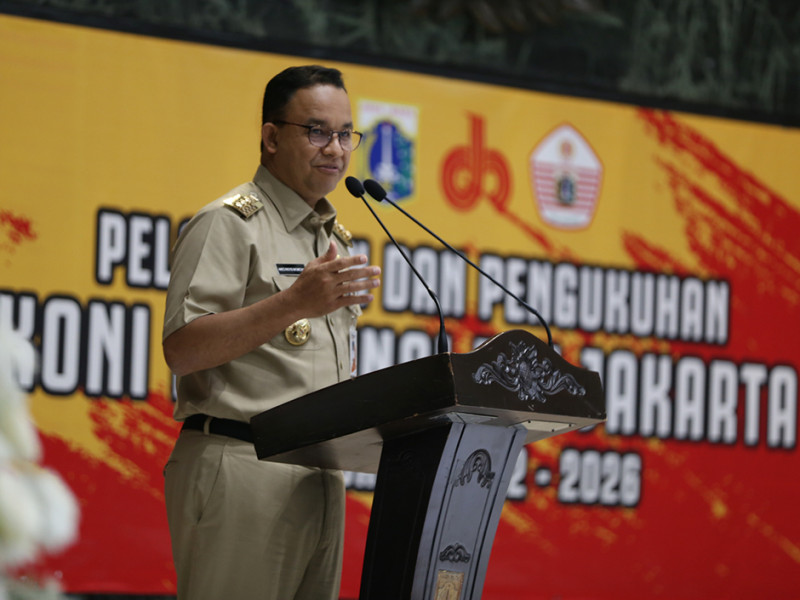 Gubernur DKI Jakarta, Anies Baswedan menghadiri Pelantikan Pengurus Komite Olahraga Nasional Indonesia (KONI) DKI Jakarta periode 2022-2026 di Balai Agung, Balai Kota DKI Jakarta, Selasa (26/4). Selain melantik 58 pengurus baru, pengukuhan juga dilakukan kepada Hidayat Humaid selaku Ketua Umum KONI DKI Jakarta periode 2022-2026. (Foto: Reza Hapiz/beritajakarta.id)