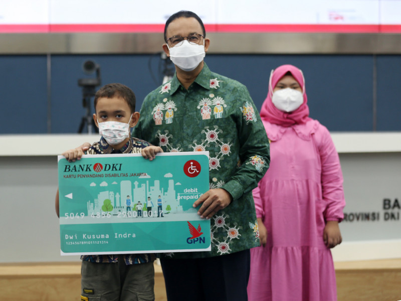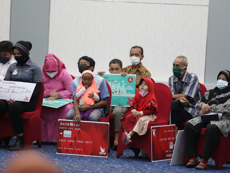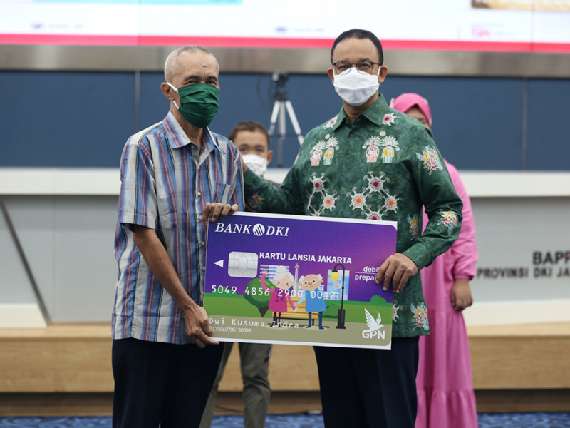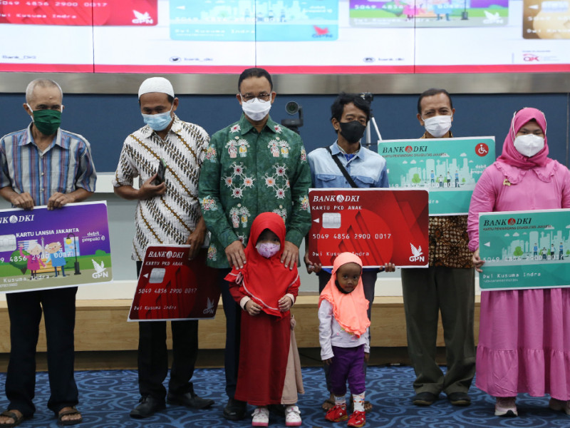 Gubernur Provinsi DKI Jakarta, Anies Baswedan, secara simbolis menyalurkan bantuan sosial (bansos) Pemenuhan Kebutuhan Dasar (PKD) kepada penerima baru Kartu Lansia Jakarta (KLJ), Kartu Penyandang Disabilitas Jakarta (KPDJ), Kartu Anak Jakarta (KAJ), dan dana stimulan karang taruna, serta diikuti dengan penyerahan Kartu Pekerja Jakarta (KPJ) Tahap 2, di Ruang Pola Balai Kota Jakarta pada Kamis (28/4). Adapun jumlah penerima KLJ sebanyak 104.448 orang, jumlah penerima KPDJ sebanyak 14.230 orang, dan jumlah penerima KAJ sebanyak 10.553 anak dan Kartu Pekerja Jakarta Tahap 2 Tahun 2022 sebanyak 457 kartu. (Foto: Reza Hapiz/beritajakarta.id)