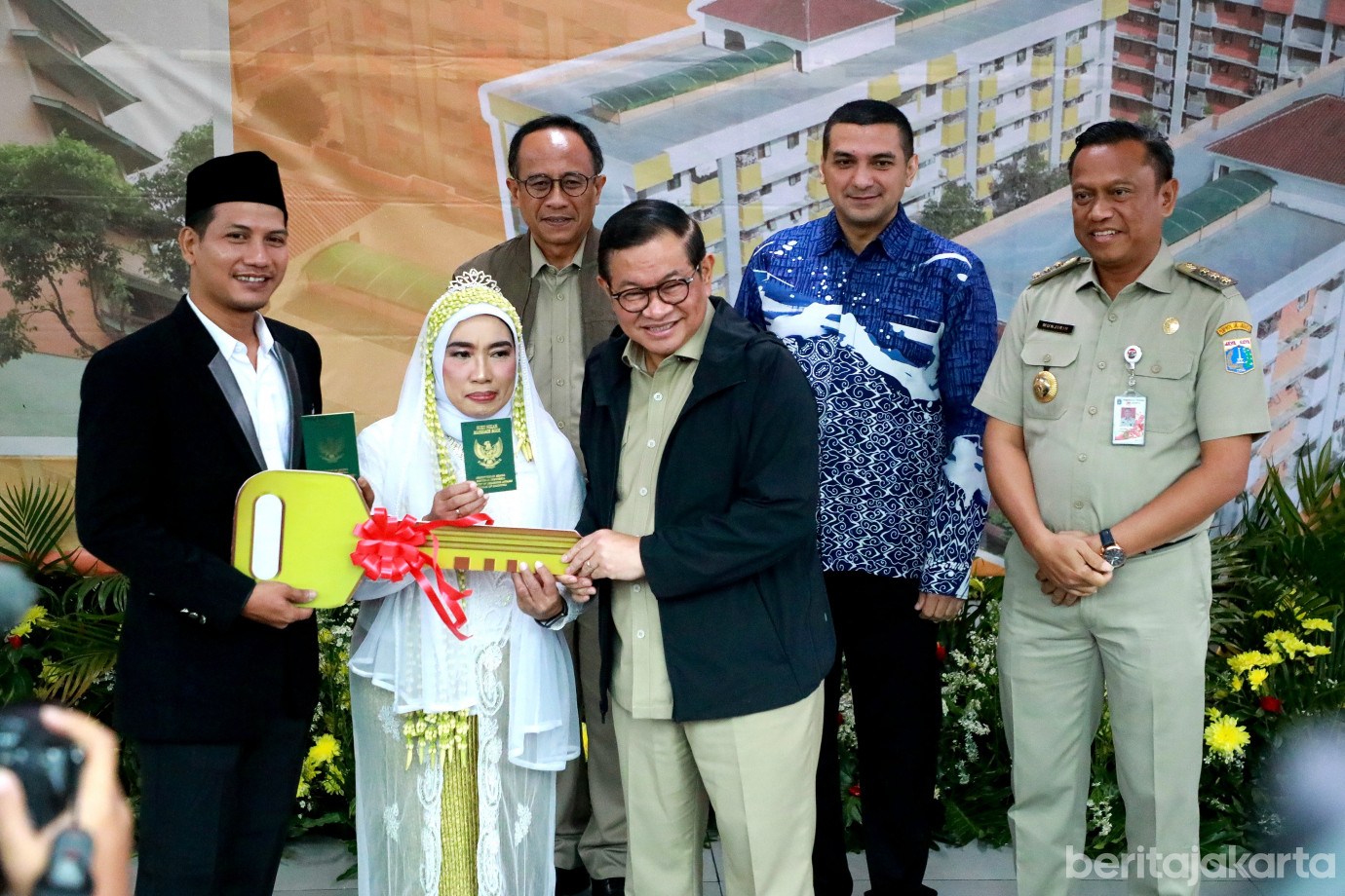 Gubernur DKI Jakarta, Pramono Anung menyerahkan kunci kepada 73 Kepala Keluarga (KK) yang direlokasi dari Tempat Pemakaman Umum (TPU) Kebon Nanas ke Rusunawa Pulogebang, Cakung, Jakarta Timur, Senin (12/1). Penyerahan ini merupakan upaya Pemerintah Provinsi (Pemprov) DKI dalam memberikan hunian yang lebih layak kepada warganya sekaligus mempercepat pengembalian fungsi lahan tempat pemakaman umum guna menambah ketersediaan lahan pemakaman di Jakarta.