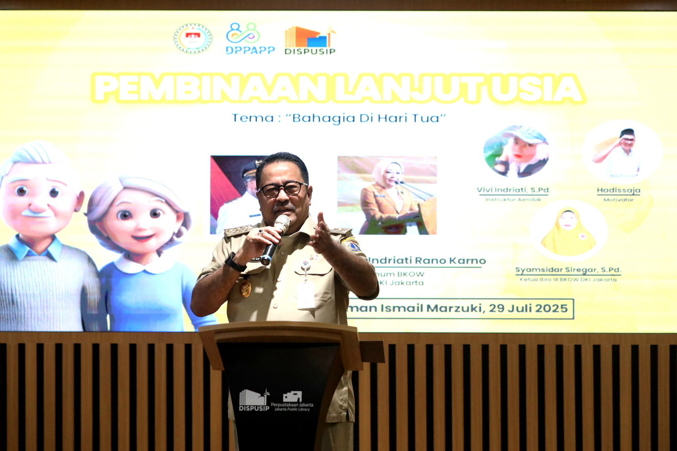 Wakil Gubernur DKI Jakarta, Rano Karno membuka kegiatan Pembinaan Lanjut Usia (Lansia) di Aula Pusat Dokumentasi Sastra (PDS) HB Yasin, Taman Ismail Marzuki (TIM), Menteng, Jakarta Pusat. Selasa (29/7). Kegiatan yang bertemakan "Bahagia di Hari Tua" ini diselenggarakan oleh Badan Koordinasi Organisasi Wanita (BKOW) DKI Jakarta diikuti sebanyak 60 peserta.