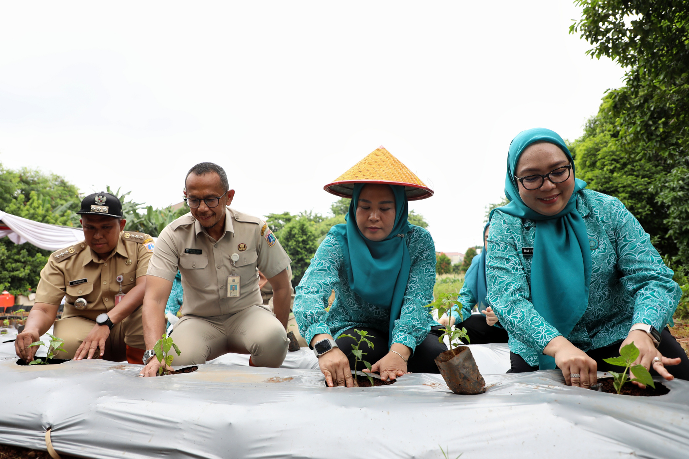 Tim Penggerak (TP) Pemberdayaan dan Kesejahteraan Keluarga (PKK) Jakarta Selatan mengikuti gerakan tanam serentak di Kebun Berseri Bintaro, Perumahan Bukit Mas, Bintaro, Pesanggrahan, Jakarta Selatan, Selasa (21/1). Kegiatan tanam serentak ini dilakukan di 10 Kecamatan, 65 Kelurahan, 62 RPTRA, 450 poktan hatinya PKK, serta seluruh RW dan para penggiat Urban farming di Jakarta Selatan untuk mendukung swasembada pangan lokal.