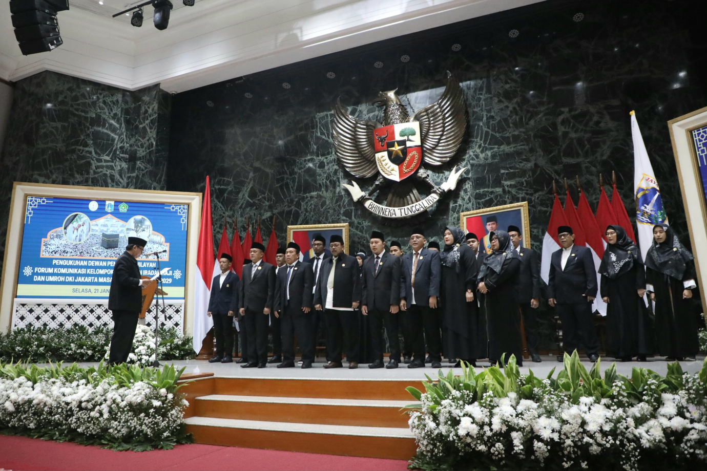 Pelaksana Tugas (Plt) Kepala Biro Pendidikan Mental dan Spiritual (Dikmental) Setda Provinsi DKI Jakarta, Aceng Zaini menghadiri Pelantikan Pengurus Wilayah Forum Komunikasi Kelompok Bimbingan Ibadah Haji dan Umroh (FK-KBIHU) Provinsi DKI Jakarta masa bakti 2024-2029 di Balai Agung, Balai Kota DKI Jakarta, Selasa (21/1). Dalam kegiatan ini sebanyak 19 anggota pengurus FK-KBIHU Provinsi DKI Jakarta Masa Bakti 2024-2029 resmi dikukuhkan.