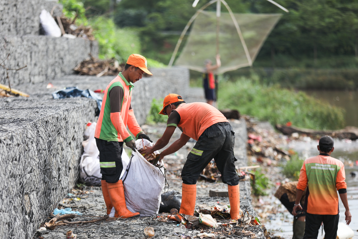 Petugas Unit Penanganan Sampah (UPS) Badan Air Kecamatan Cipayung membersihkan sampah di tepi Waduk Pondok Ranggon, Cipayung, Jakarta Timur, Senin (20/1). Petugas dapat mengumpulkan sedikitnya 24 kubik sampah tiap pekan dari sampah yang diambil dari waduk setiap harinya.