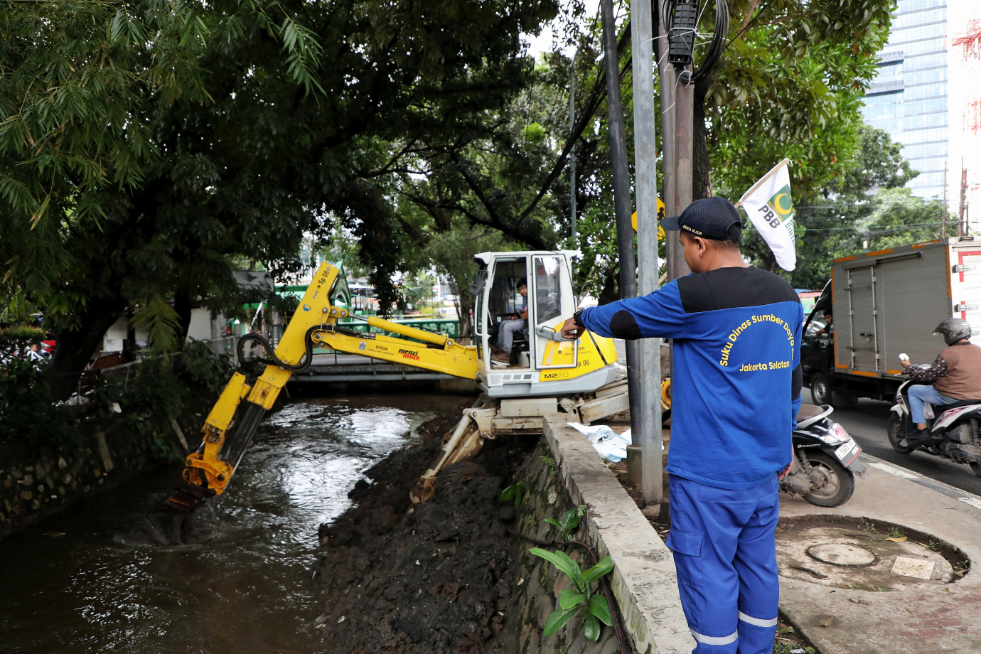 Satuan Pelaksana Sumber Daya Air (Satpel SDA) Kecamatan Pancoran melakukan pengerukan lumpur di Kali Baru Barat, Kalibata, Pancoran, Jakarta Selatan, Senin (20/1). Sepanjang kurang lebih 500 meter aliran Kali Baru Barat dikeruk pada 11 titik untuk menambah daya tampung air pada aliran Kali tersebut.