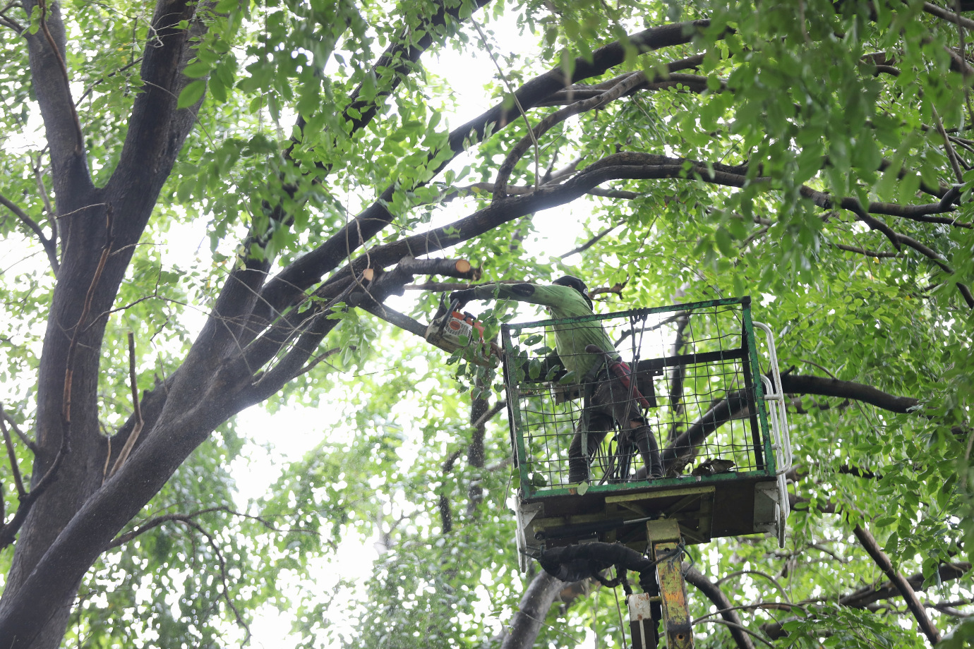 Sebanyak 56 pohon rindang ditoping di Kecamatan Duren Sawit, Jakarta Timur, Rabu (8/1). Penopingan yang masuk dalam program grebek penopingan rutin setiap Rabu ini untuk antisipasi terjadinya kasus pohon tumbang saat musim hujan.