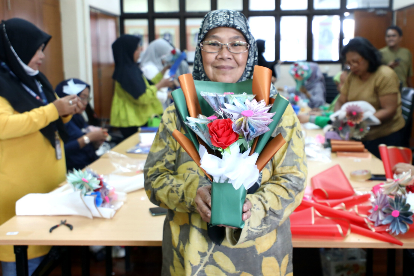 Suku Dinas Perindustrian Perdagangan, Koperasi,Usaha Kecil dan Menengah (Sudin PPKUKM) Jakarta Utara menggelar pelatihan Money Bouquet di Tempat Kumpul Kreatif (TKK) Jakarta Utara, Jalan Lorong 103, Koja, Jakarta Utara, Jumat (29/11). Pelatihan ini dikuti 14 peserta yang berasal dari wilayah Jakarta Utara dan dengan mengikuti pelatihan ini diharapkan para peserta memiliki keahlian lebih untuk meningkatkan potensial ekonomi keluarga.