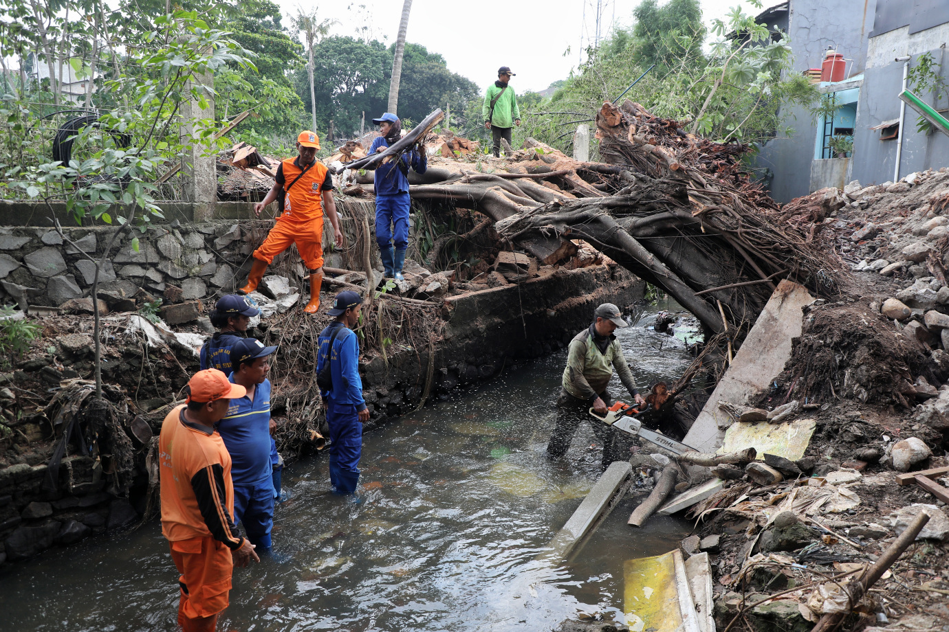 Sejumlah petugas gabungan melakukan penanganan longsor di saluran penghubung (Phb) Pulo, kawasan Pasar Lenteng Agung, Kelurahan Jagakarsa, Kecamatan Jagakarsa, Jakarta Selatan, Rabu (13/11). Longsor yang terjadi pada Senin (11/11) tersebut disebabkan oleh pohon beringin besar yang tumbang akibat hujan deras yang disertai angin kencang.