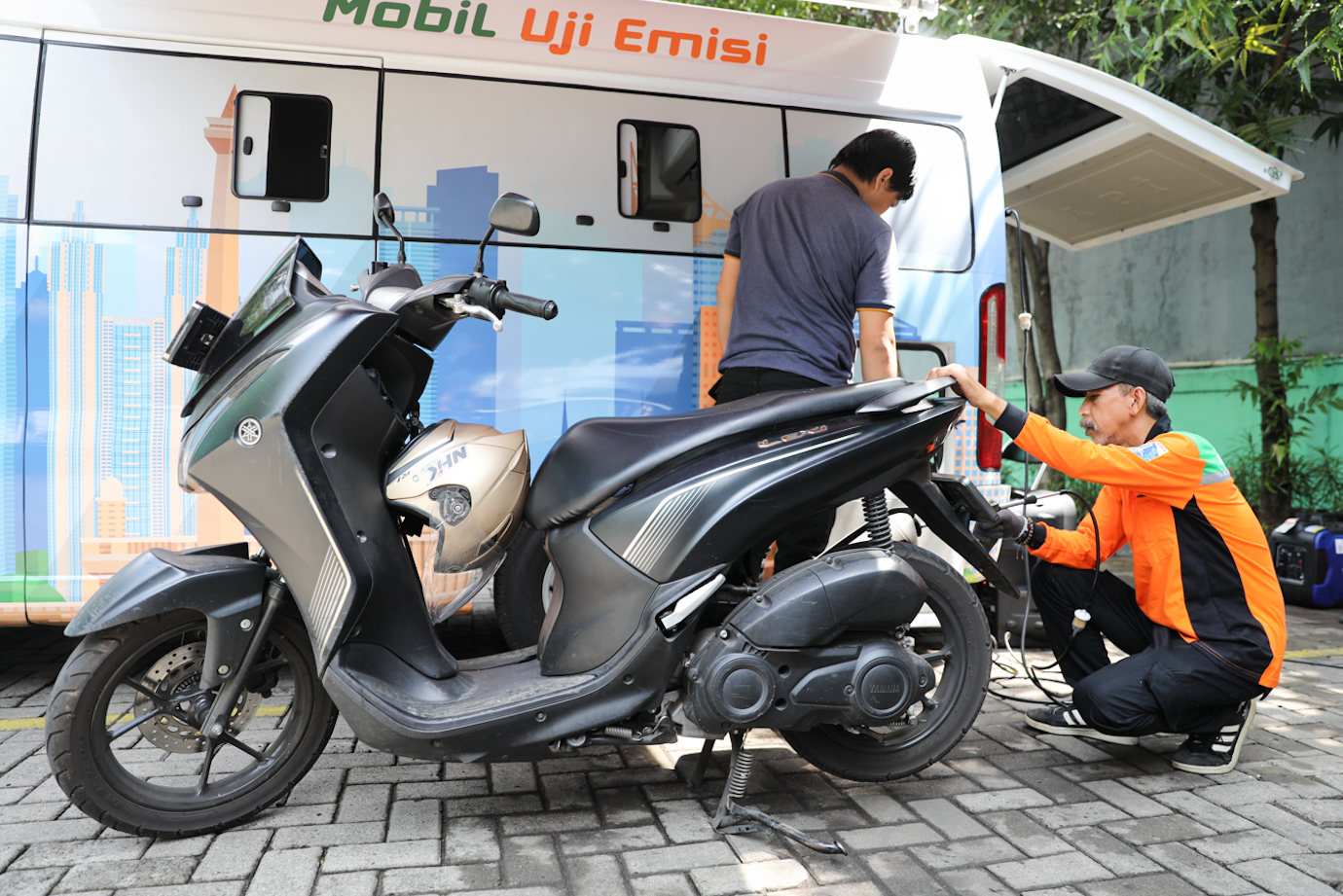 Petugas melakukan uji emisi kendaraan bermotor roda dua dan roda empat di halaman Kantor Suku Dinas Lingkungan Hidup (Sudin LH) Jakarta Timur, Makasar, Selasa (12/11). Layanan uji emisi gratis digelar pukul 09.00-12.00 dalam rangka memperingati Hari Pahlawan Nasional yang jatuh pada tanggal 10 November.