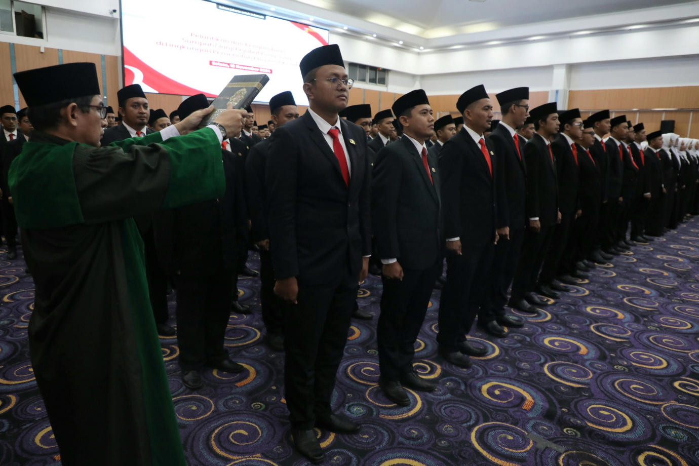 Sekretaris Daerah DKI Jakarta, Marullah Matali melantik dan mengambil sumpah sebanyak 500 pejabat fungsional guru di Ruang Serbaguna Gedung Dinas Teknis Abdul Muis, Jalan Abdul Muis, Gambir, Jakarta Pusat, Selasa (12/11). 500 pejabat fungsional guru yang dilantik terdiri dari 308 guru SD, 110 guru SMP, 71 guru SMA, delapan guru SMK, satu guru SLB dan Dua guru TK.