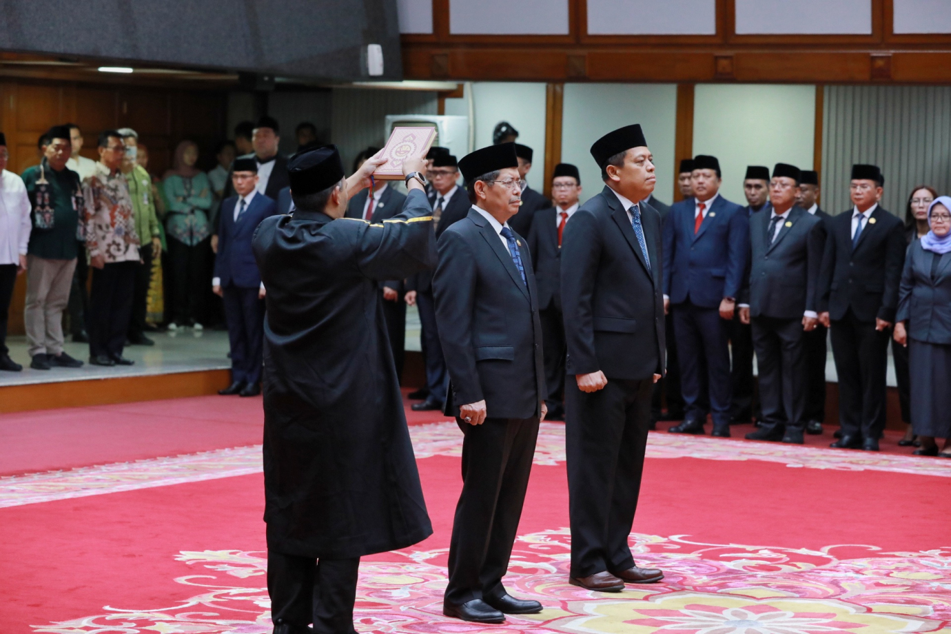 Penjabat (Pj) Gubernur DKI Jakarta, Teguh Setyabudi melantik Marullah Matali sebagai Sekretaris Daerah (Sekda) DKI Jakarta dan Joko Agus Setyono sebagai Deputi Gubernur Bidang Industri, Perdagangan dan Transportasi DKI Jakarta di Balai Agung, Balai Kota DKI Jakarta, Jumat (8/11). Pelantikan Pimpinan ini berdasarkan Keputusan Presiden Nomor 166/TPA Tahun 2024 tentang Pemberhentian dan Pengangkatan dari dan dalam Jabatan Pimpinan Tinggi Madya di Lingkungan Pemerintah Provinsi DKI Jakarta yang berlaku sejak tanggal 8 November 2024.