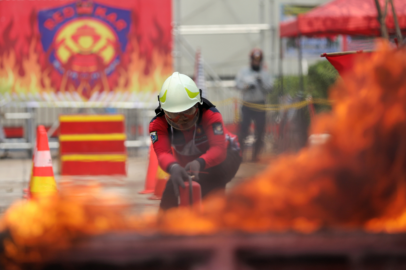Relawan Pemadam Kebakaran (Redkar) mengikuti lomba ketangkasan di Kantor Suku Dinas Penanggulangan Kebakaran dan Penyelamatan (Gulkarmat) Jakarta Selatan, Pondok Pinang, Kebayoran Lama, Jakarta Selatan, Rabu (30/10). Lomba ketangkasan memadamkan api ini diikuti 650 Redkar dari 65 kelurahan se-Jakarta Selatan akan berlangsung hingga 31 Oktober 2024.