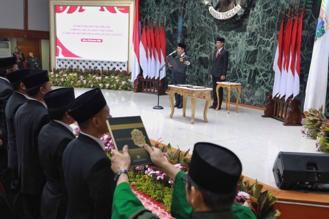 Penjabat (Pj) Gubernur DKI Jakarta, Teguh Setyabudi melantik 300 orang pejabat fungsional guru di Balai Agung, Balai Kota DKI Jakarta, Rabu (30/10). Pelantikan ditandai dengan pengambilan sumpah dan janji para pejabat fungsional. Pj Gubernur Teguh dalam sambutannya berpesan kepada pejabat yang dilantik agar tetap amanah dan menjalankan kewajiban dengan rasa tanggung jawab, sehingga dapat berkontribusi untuk kemajuan Jakarta yang sesuai dengan bidang masing-masing.