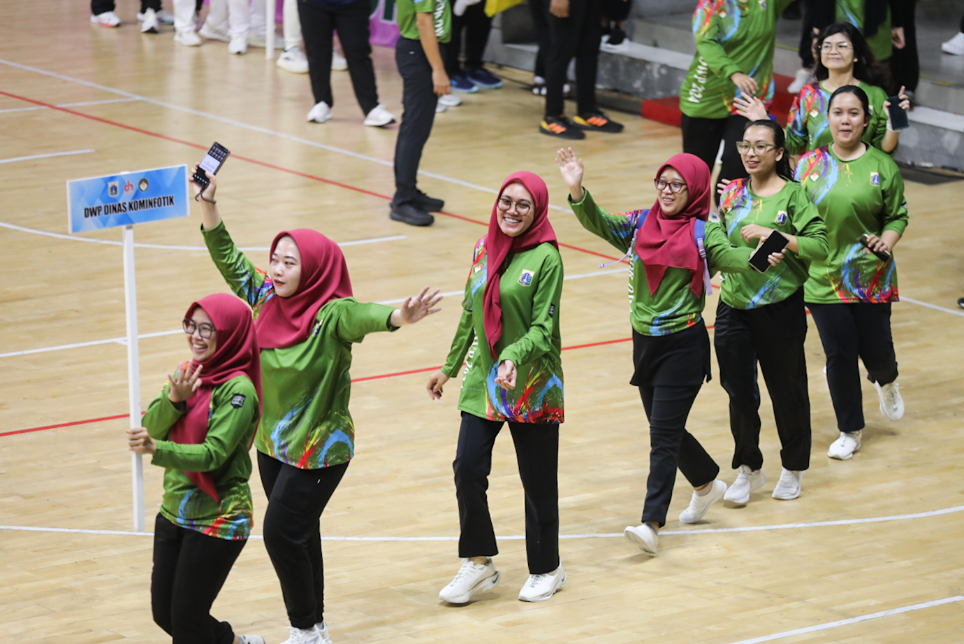 Dharma Wanita Persatuan (DWP) beserta ASN dan PJLP putri Diskominfotik berpartisipasi dalam Pekan Olahraga (POR) Dharma Wanita Persatuan DKI Jakarta 2024 di Gelanggang Mahasiswa Soemantri Brodjonegoro (GMSB) Kuningan, Setiabudi, Jakarta Selatan, Rabu (30/10). POR DWP 2024 memperlombakan senam kreasi dan berbagai jenis olahraga tradisional, di antaranya dampu, bola keranjang, balap kardus dan voli sarung.