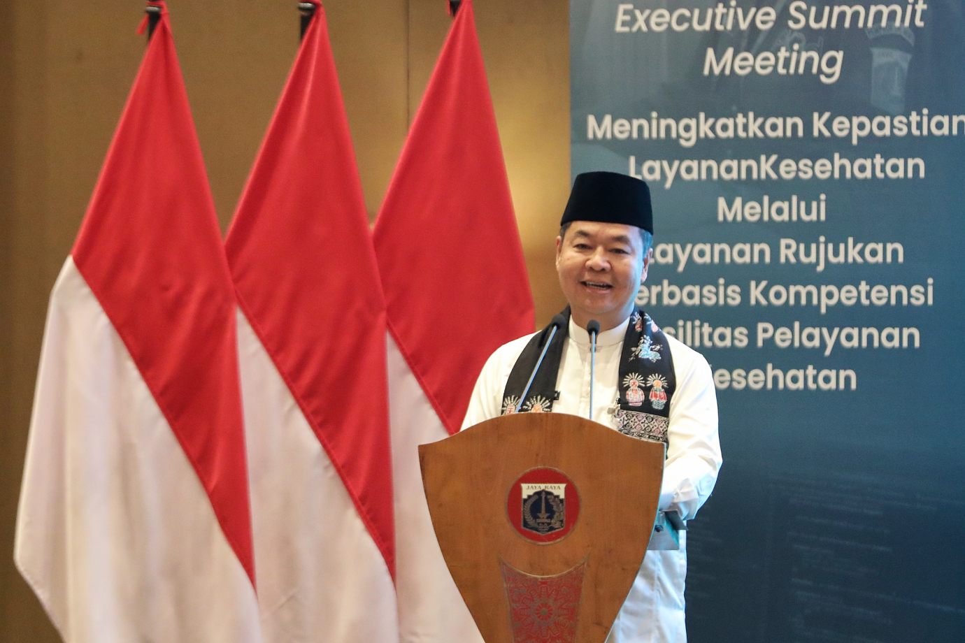 Penjabat (Pj) Gubernur DKI Jakarta, Teguh Setyabudi membuka kegiatan Executive Summit Meeting (ESM) Dinas Kesehatan Provinsi DKI Jakarta untuk meningkatkan layanan kesehatan melalui layanan rujukan berbasis kompetensi fasilitas pelayanan kesehatan, di Hotel Aryaduta, Menteng, Jakarta Pusat, Jumat (25/10). Pj Gubernur menyambut baik pelaksanaan kegiatan ini sebagai upaya meningkatkan kualitas dan efektivitas sistem layanan kesehatan di Jakarta, khususnya dalam aspek rujukan pasien.